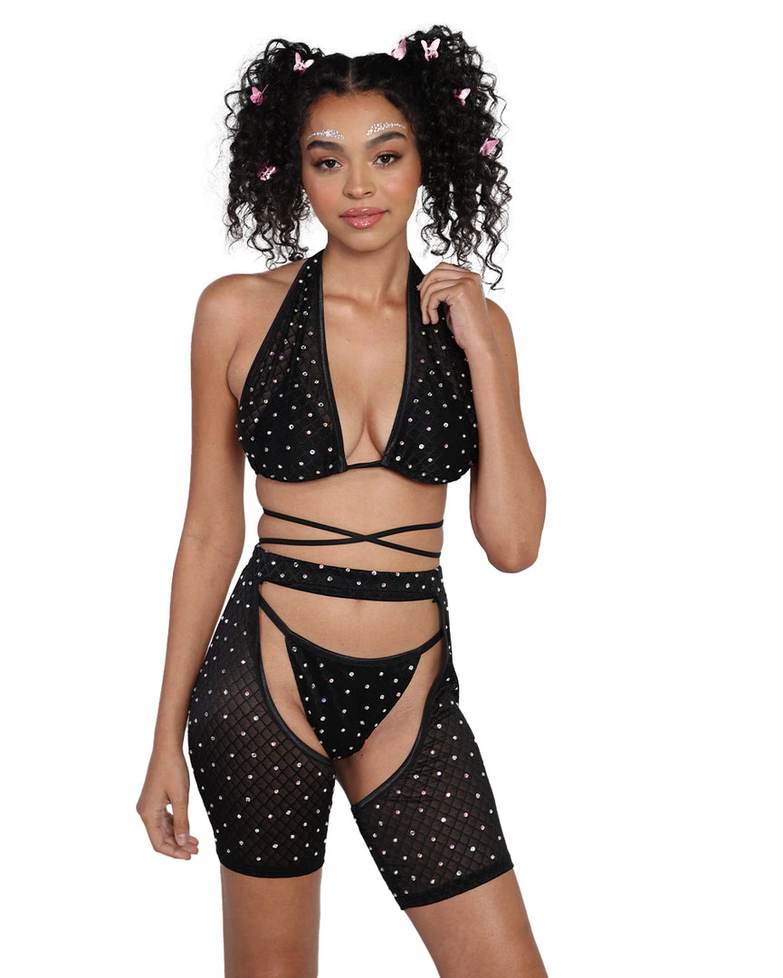 Glam it up at ur next music festival with the Badd Bish Energy Rhinestone Bikini Set. This triangle top with matching bottoms and chaps is embellished with sparkly rhinestones all over – a fit you’d want to finish off with pink platform shoes or rave fishnets.