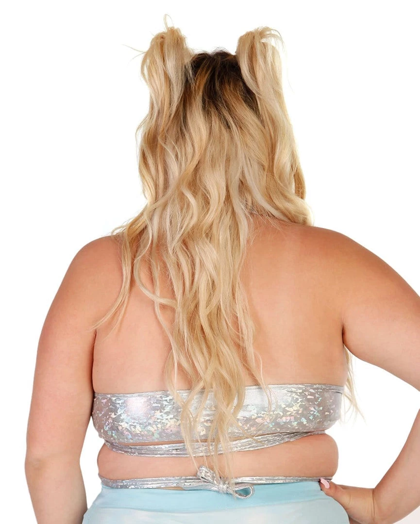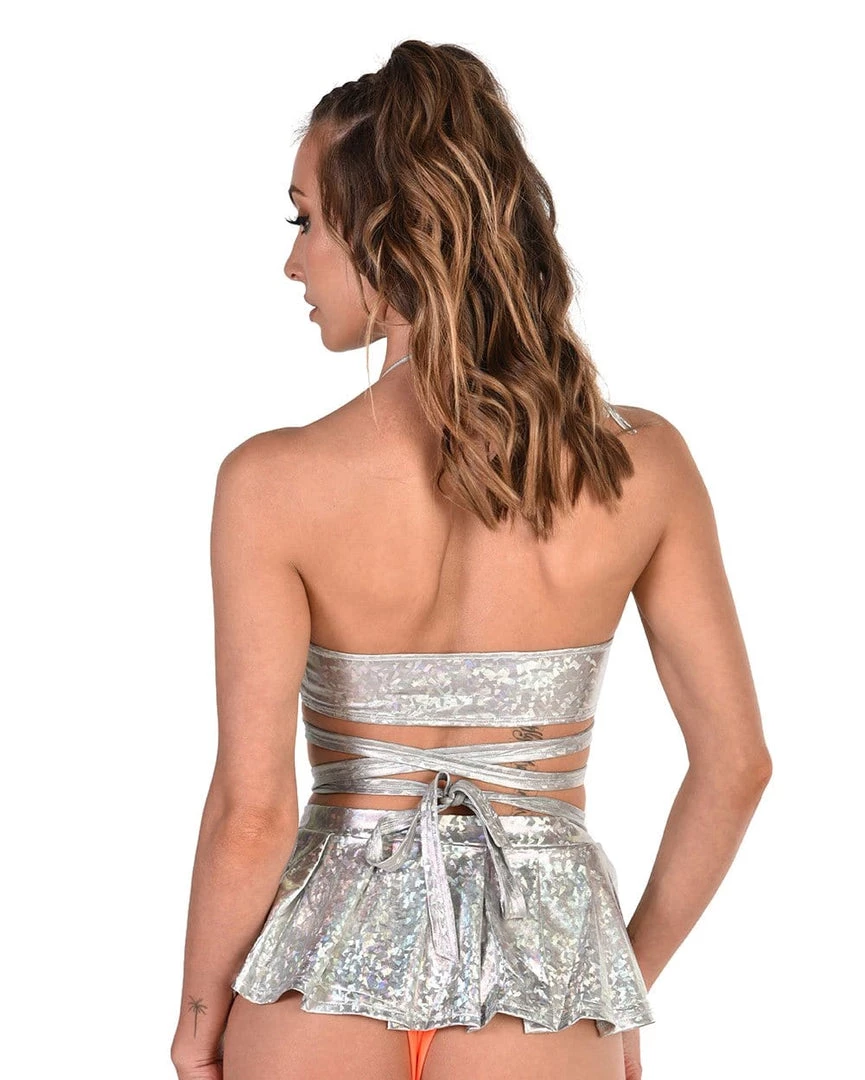 Shine brighter than ever before in our Shinin’ In Silver Holographic Wrap Around Crop Top. With gleaming, silver colors radiating with every move you make, this holographic halter top has an adjustable fit with a sassy wrap around detail. Â