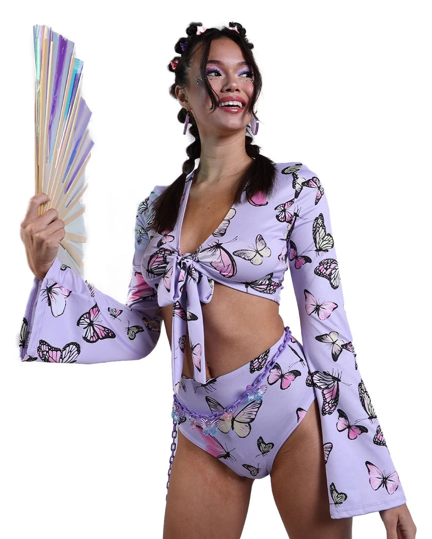 You’re feelin’ the beat flow through ya in our Butterfly Groove Front Tie Crop Top. Have the time of your life in this funky pink crop top that features a colorful butterfly fabric, stylish bell sleeve, and adjustable front tie detail.