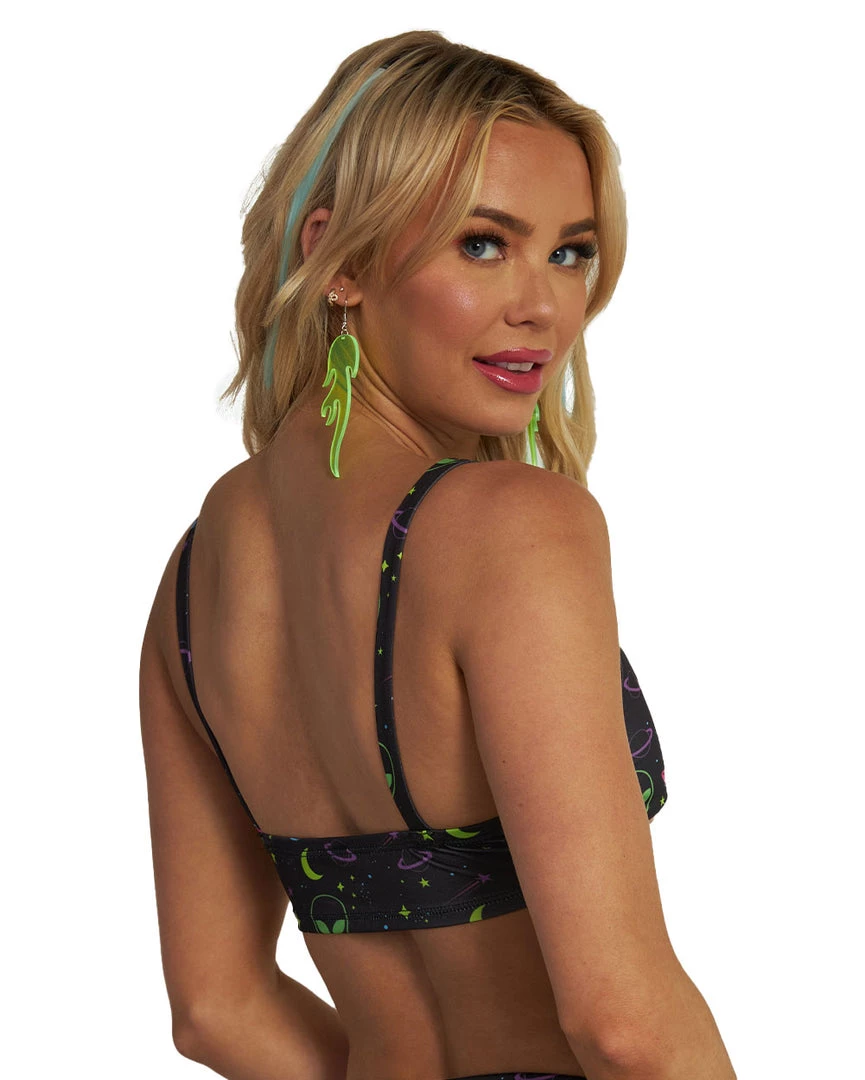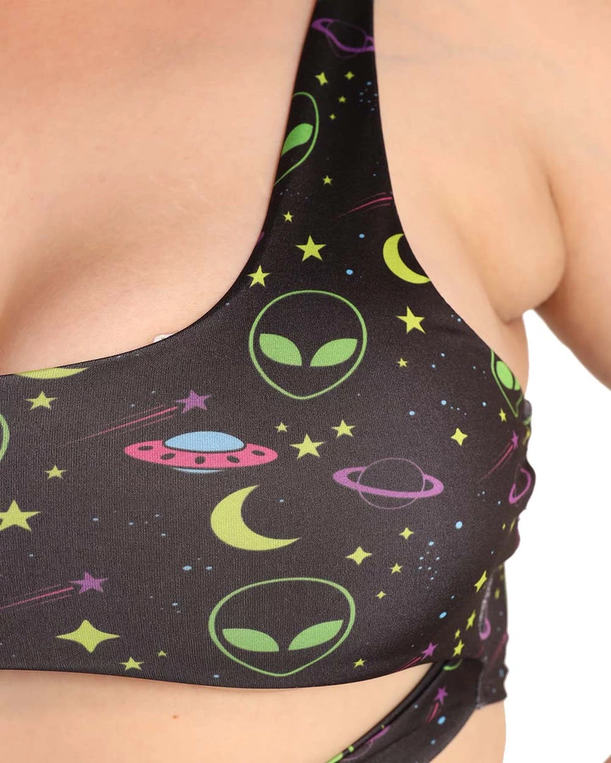 Wear the Space Frenzy Crop Top because u rule all the planets. This bralette has a scoop neckline, an underboob cutout, and a print that’s out-of-this-world.