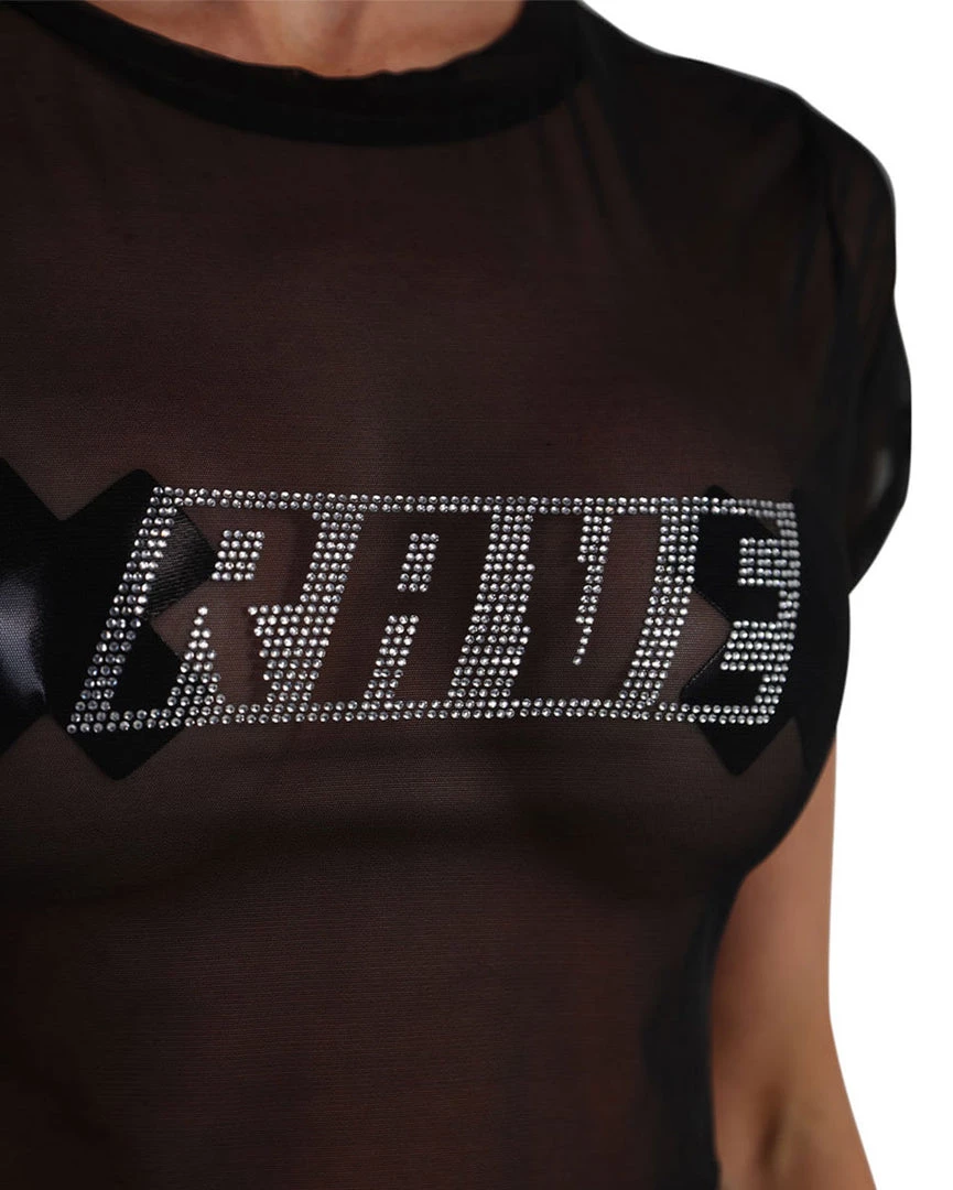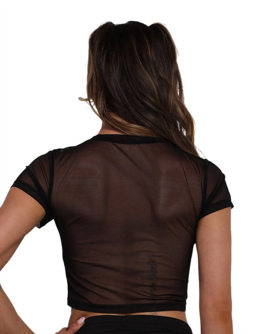 Show off ur favorite bralettes or festival pasties with the Rave, Rave, Repeat Rhinestone Mesh Crop Top. This black top is made from see-through material and features a sparkly text that reads “Rave.”