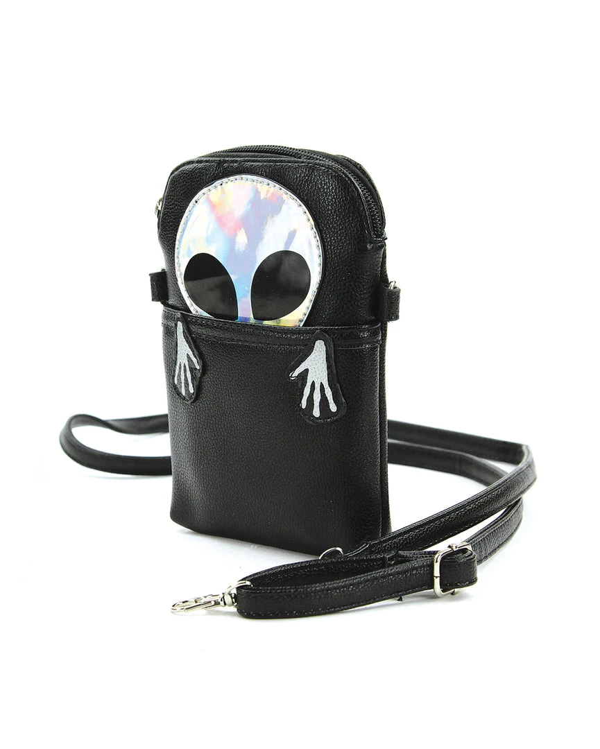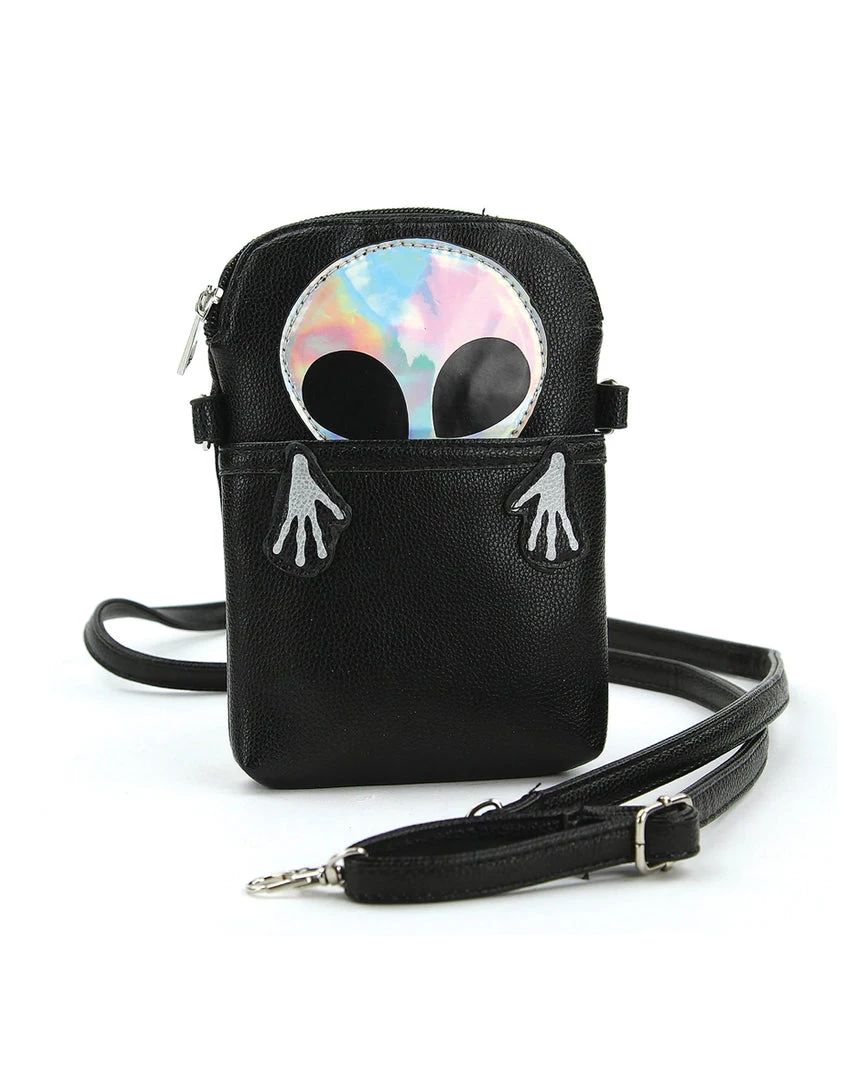 Float in space amidst the planets and stars with our Peeking Alien Crossbody Pouch. This crossbody bag has one spacious zippered compartment and one pocket on the front with a holographic alien peeking through it.