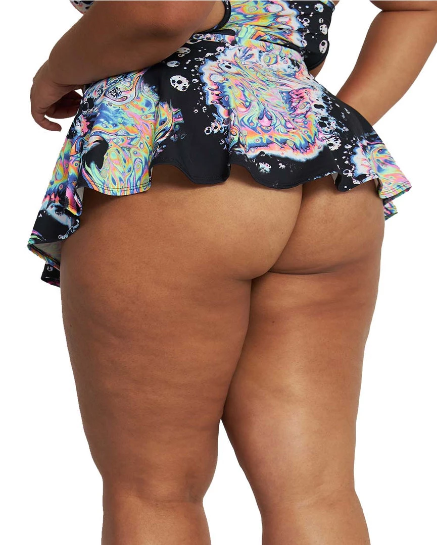 You’ll never dull ya fabulousness in our Liquid Tripp Mini Skater Skirt. This multicolored psychedelic print rave skirt features a high-waisted elastic band, pleated design, and flowy effect.Â