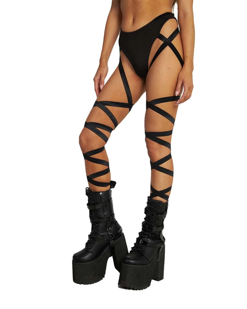 Make a dramatic entrance with the Come Closer Hi-Waist Bottoms with Leg Garters. These high-waist bikini bottoms come with attached leg garters that beautifully wrap on the legs.