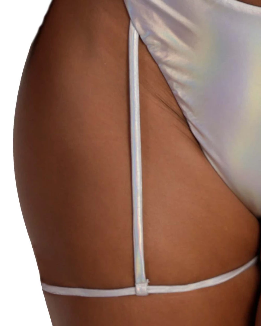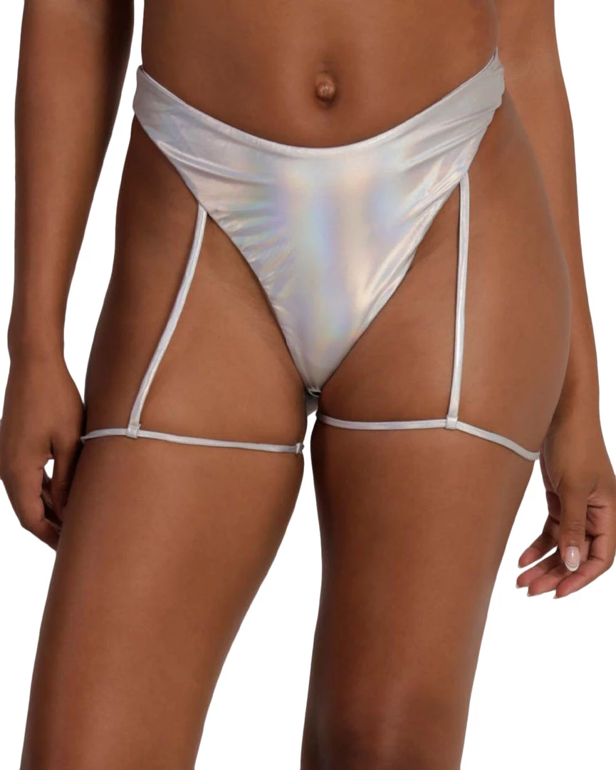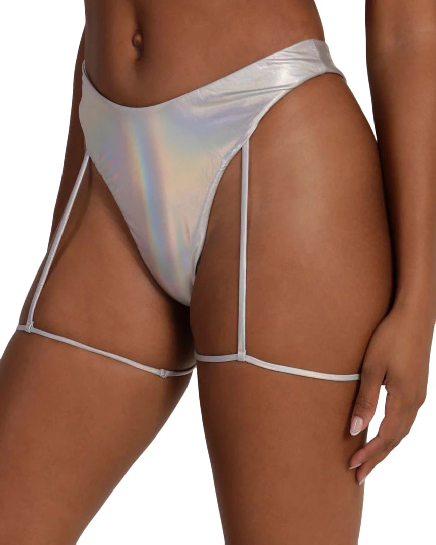 Shimmer and shine wherever u go with our Iridescent For Days Hi-Cut Leg Harness Bottoms. These bottoms showcase a mid-waist design, cheeky coverage, and attached leg harness.