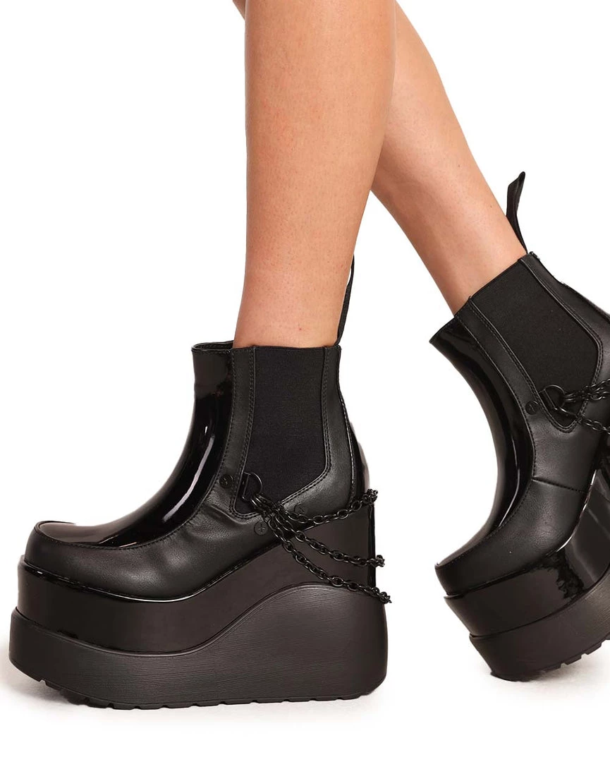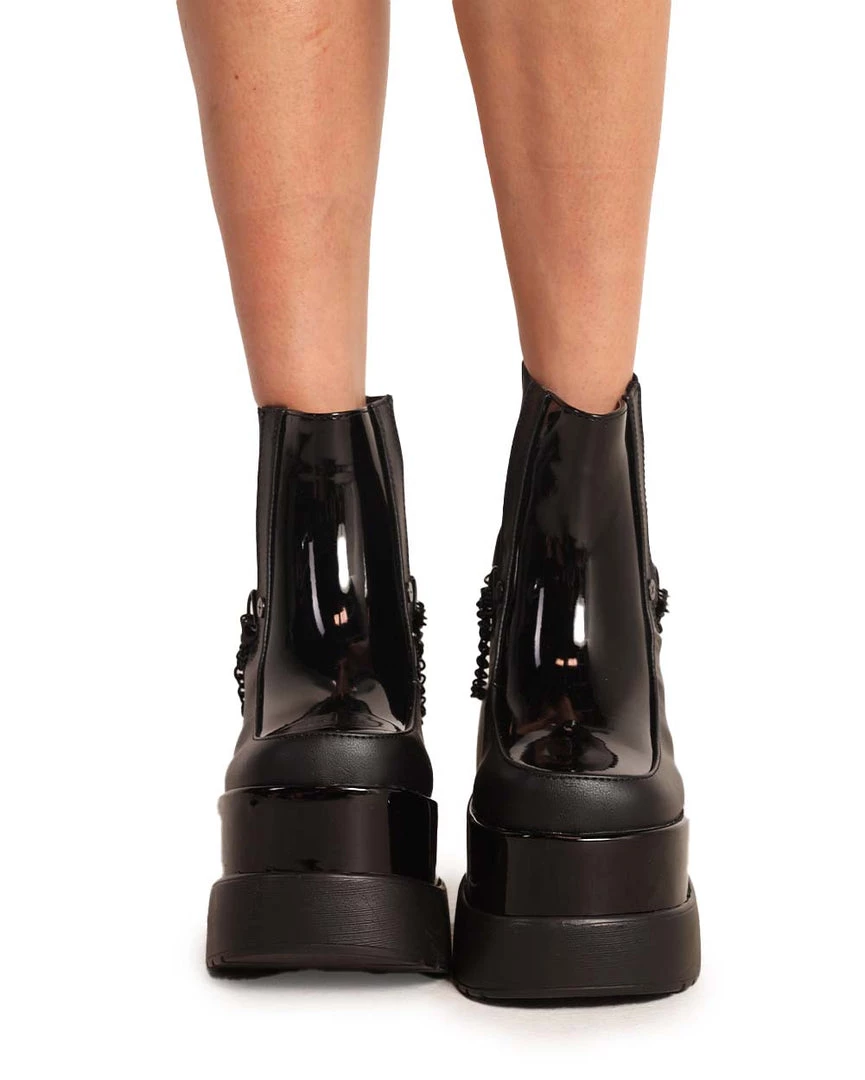 Stay sassy with these Demonia Boss Bish Platform Boots. These black boots have a glossy construction with black chains on the side and platform soles.