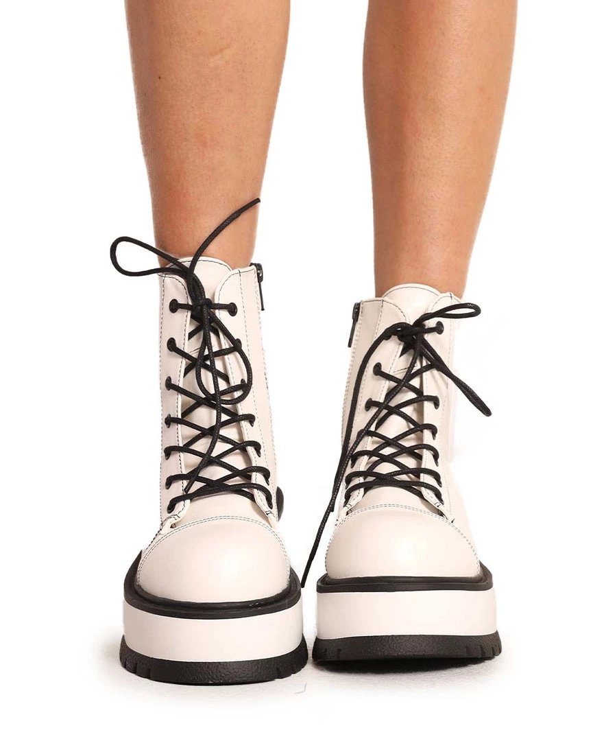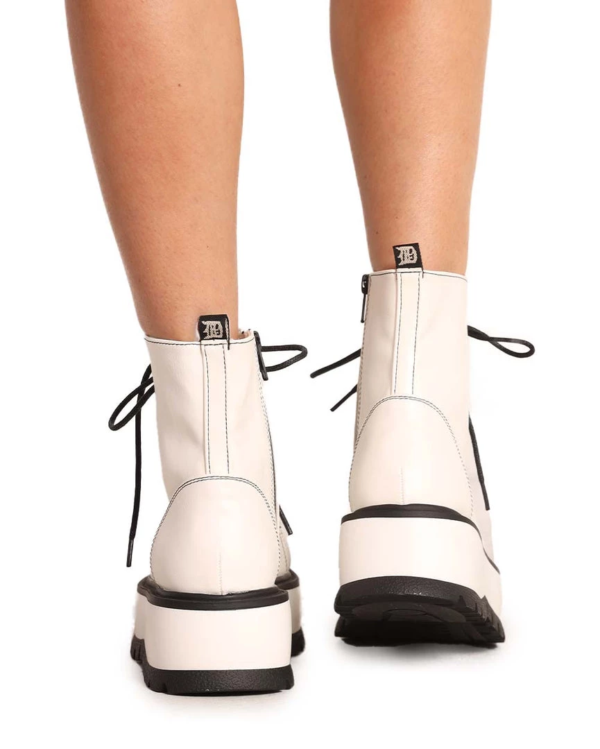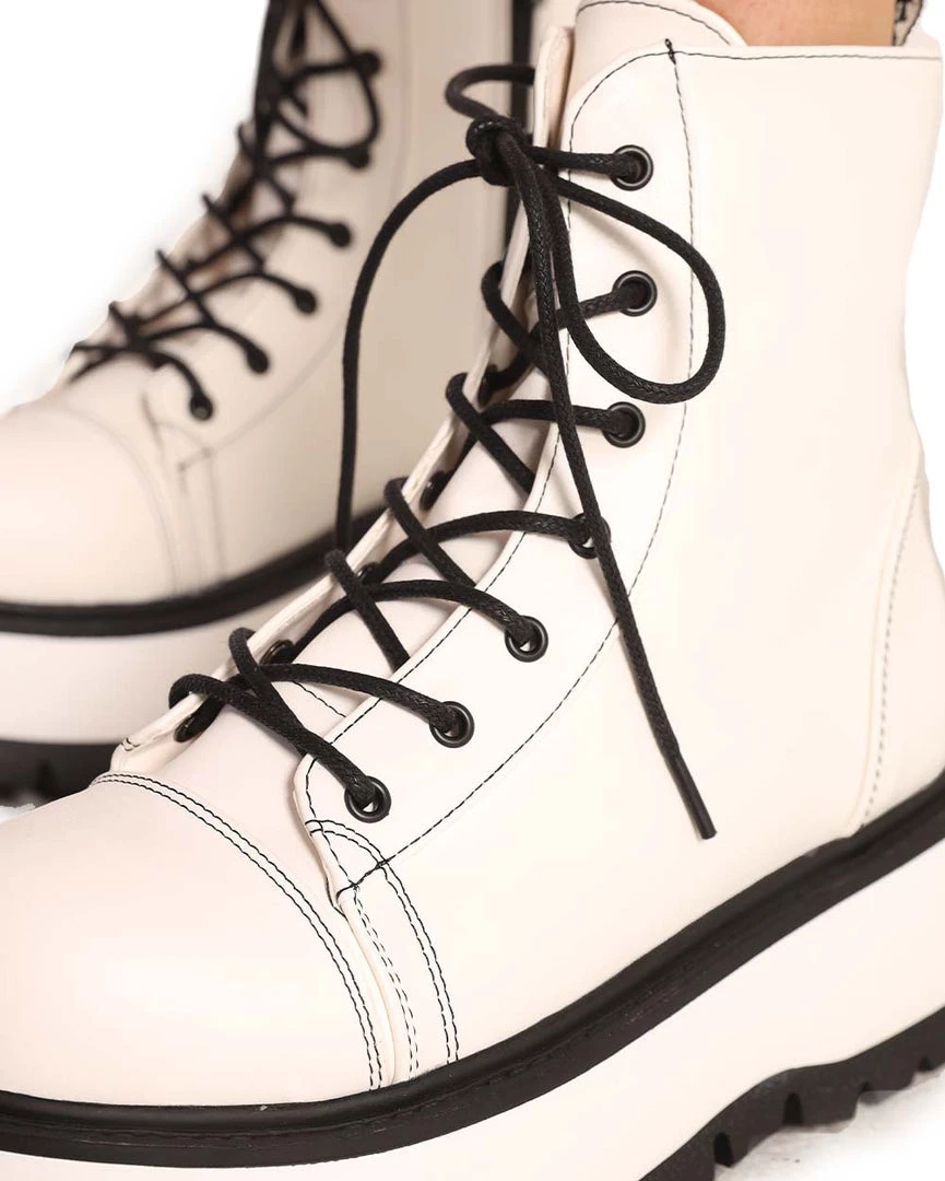 Exude high vibes with the Demonia Feel My Energy Vegan Leather Platform Boots. These boots have black details on them that contrast their white construction and lace-up closure.