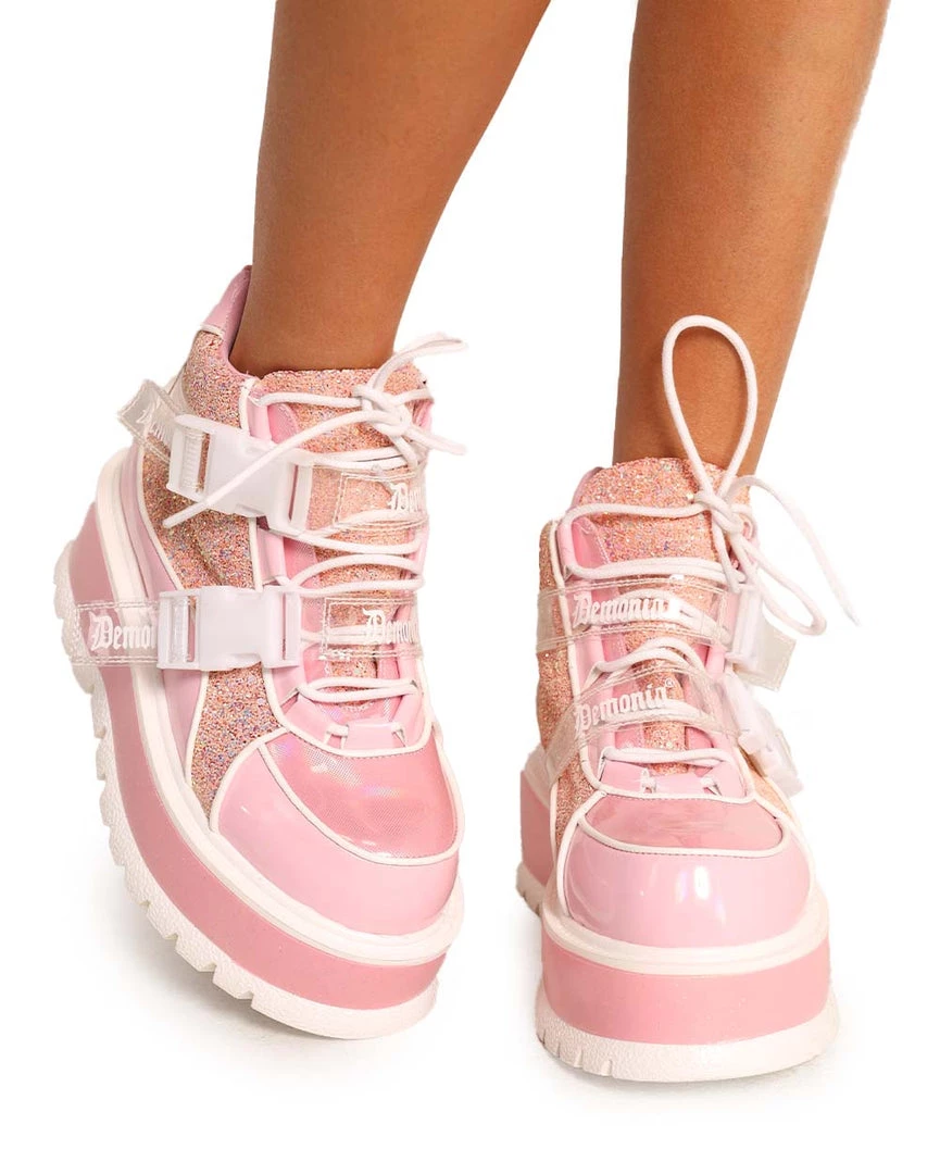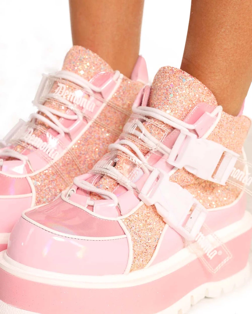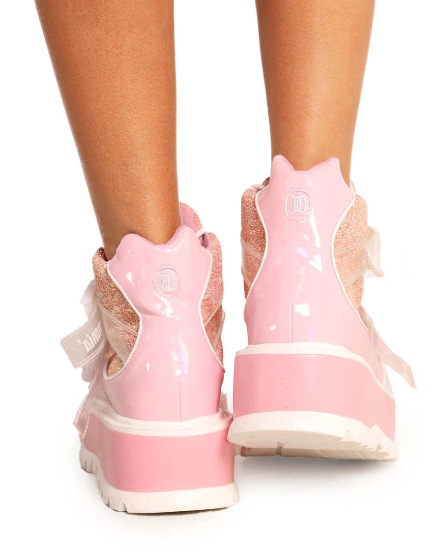 Step out with a cute trend-setting style with our Demonia Twinkle Toes Holo Platform Boots. These platform boots have a glossy pink and white construction and gold sparkles all over.