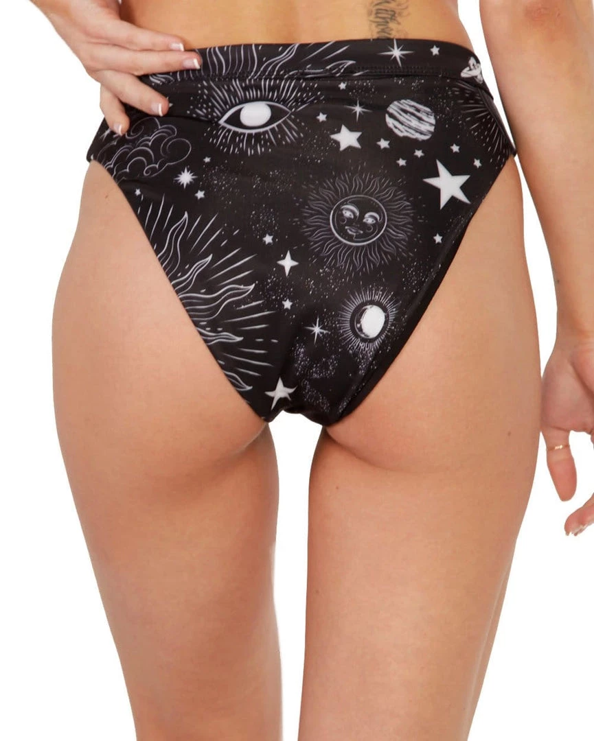 Keep it cute & astrological in our Celestial High Cut Bottoms. You’re radiant in these black & white rave bottoms that are high-waisted, high cut, and moderately cheeky.