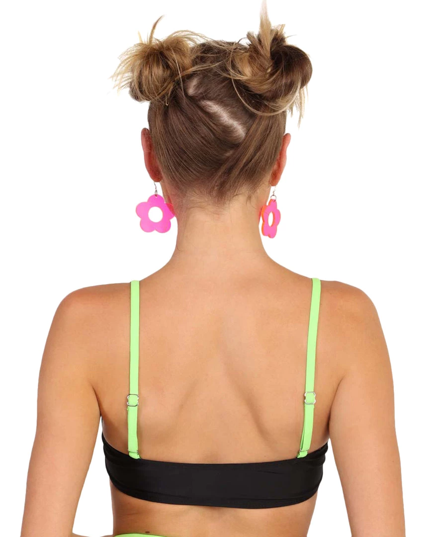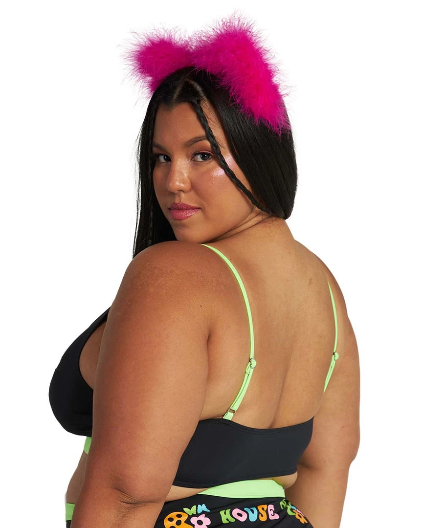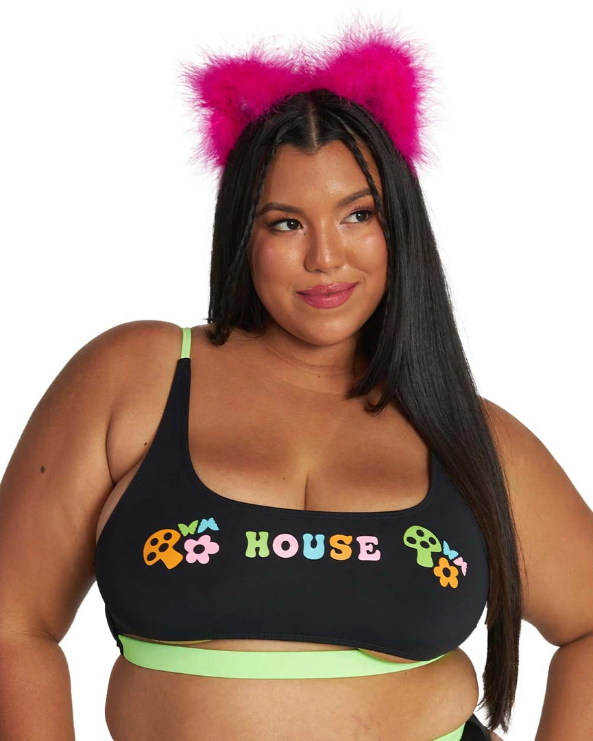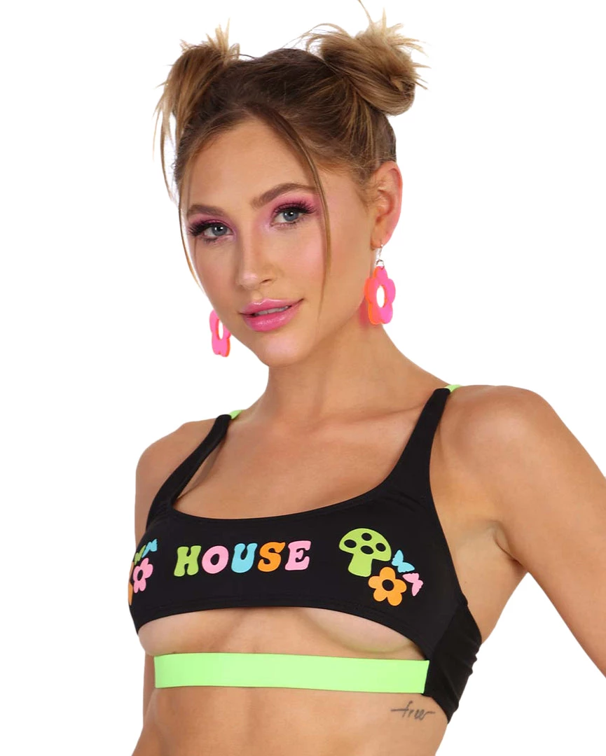 The Recycled Fabric Banger Alert Underboob Top will make u the talk of the town. This bralette features a cute neon print that reads HOUSE. Plus, it has an underboob cutout with a reflective band.