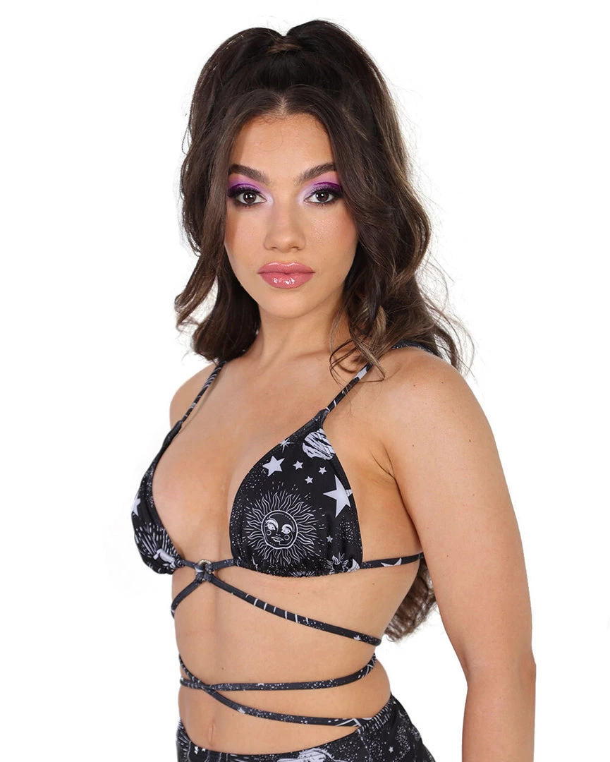 Float away to the stars with our Celestial Wrap Around Triangle Top. The dainty o-ring detailing with wrap-around string on this bikini top is just *chef’s kiss*.
