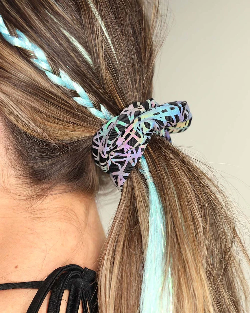 Add some wavy rainbow vibes to ur rave look with our Trippy Drip Reflective Scrunchies. They have the perfect amount of stretch to keep ur hair in place, and they look fab on ur hair and wrist, thanks to their reflective design.