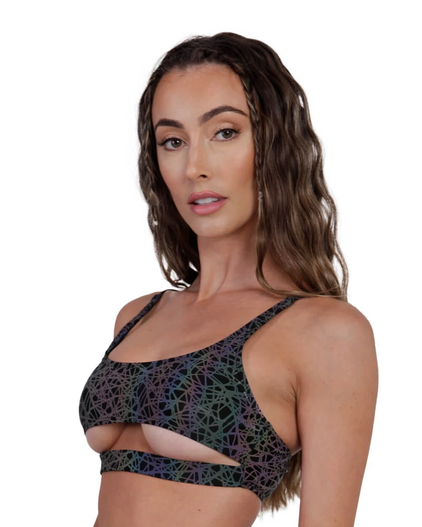 Bring some wavy vibes to ur rave fit with the Trippy Drip Reflective Underboob Top. This underboob cut-out top accentuates ur silhouette and makes u glow at night, thanks to its reflective material.