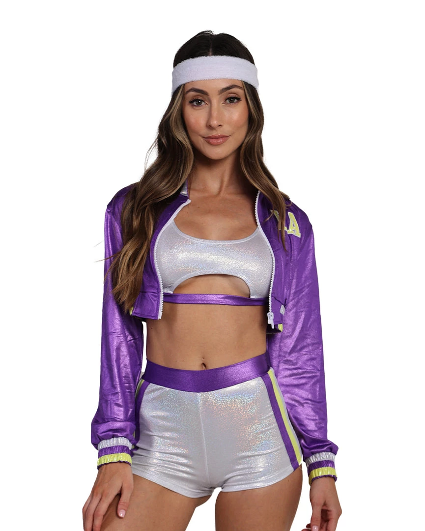 Bring ur A-game this season with our Varsity Chick Costume Set. This flirty ensemble is complete with a white underboob top, high-waisted shorts with purple trim, and a metallic bomber jacket.