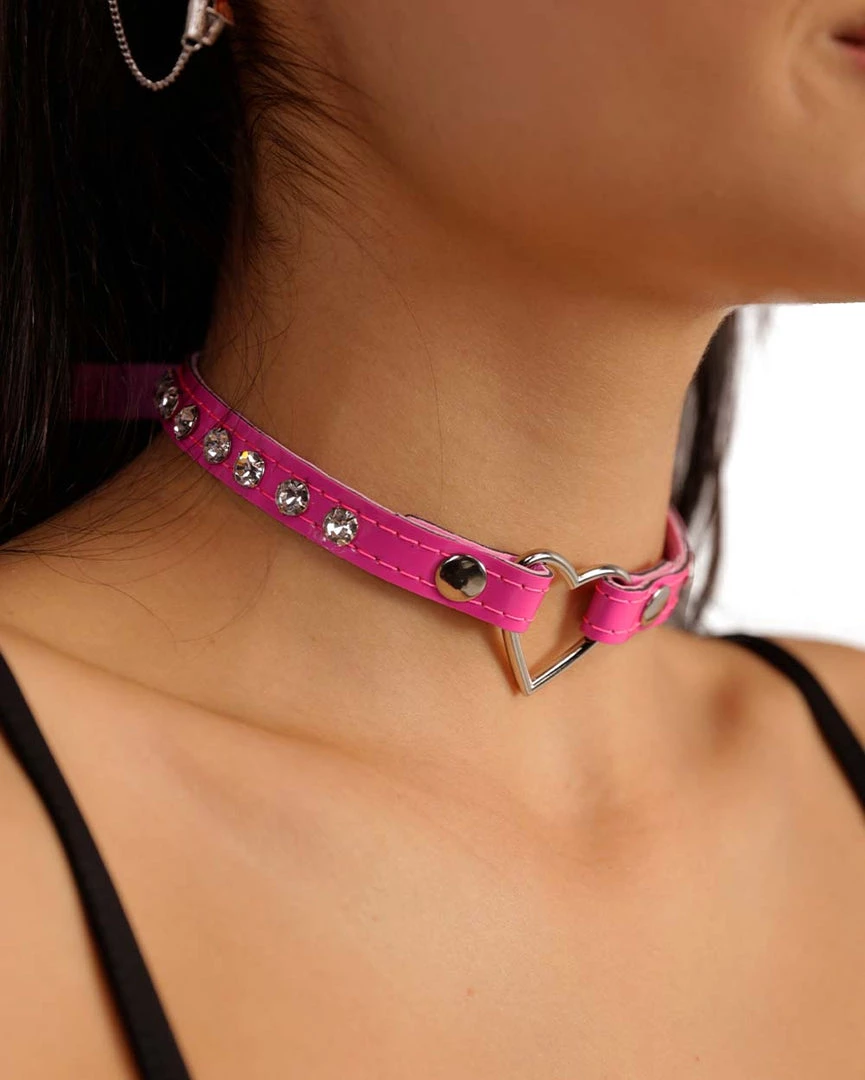 Bring on the dramatic flair with our Cross My Heart Studded Vinyl Choker. This necklace features circular metal studs, an o-ring shaped like a heart, and adjustable buckle closure.