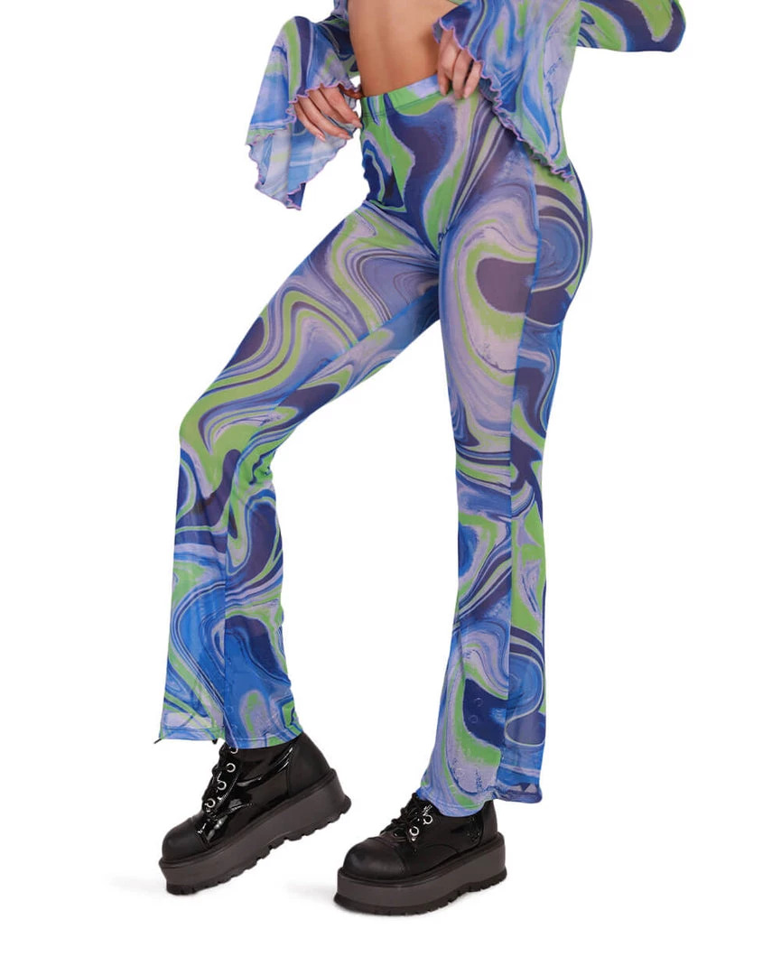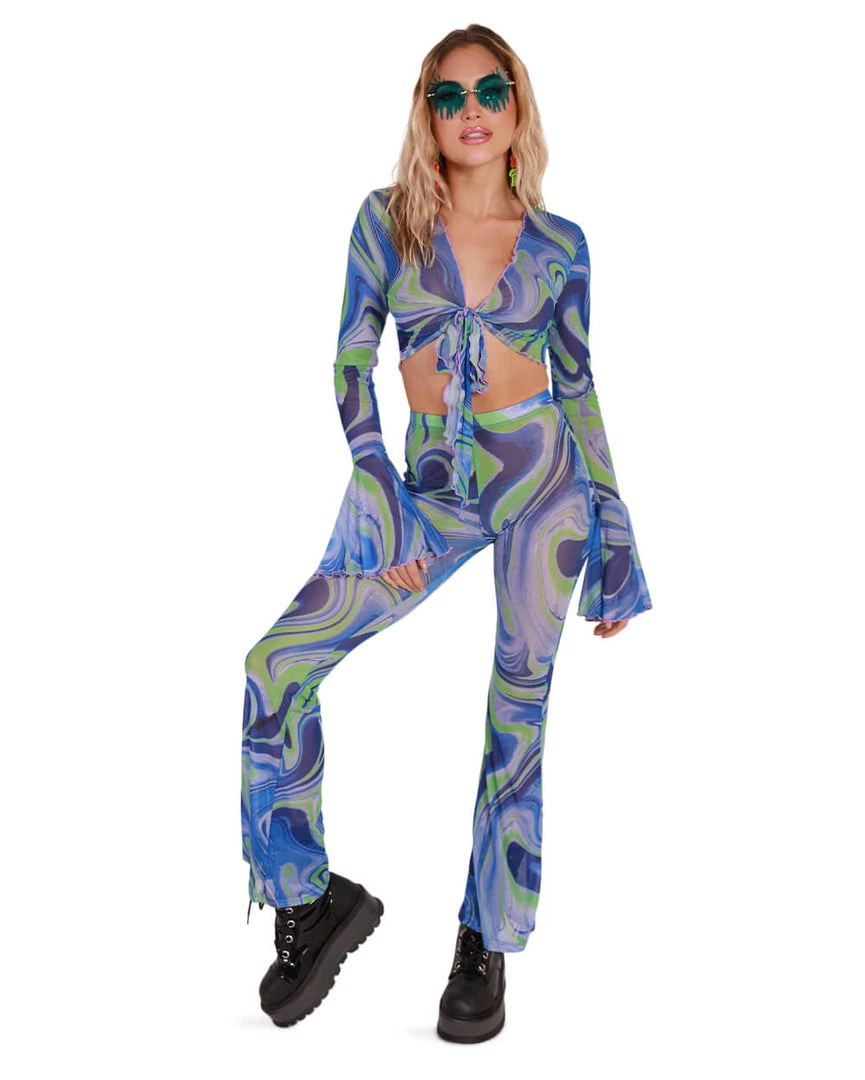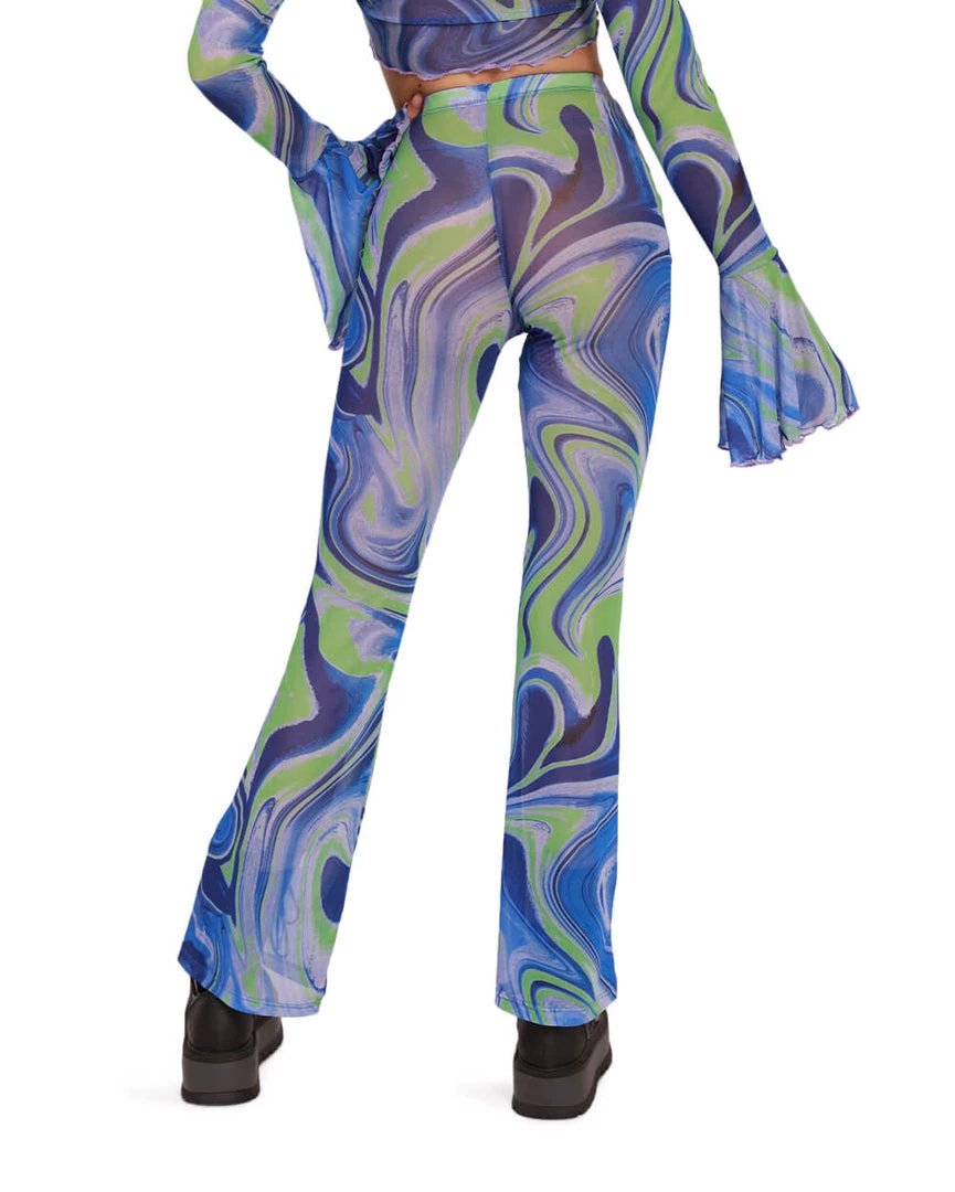 Put some wow in your wardrobe with our Blue Blossom Bell Bottoms. These bell bottoms are made from breathable mesh fabric with a groovy print all over.