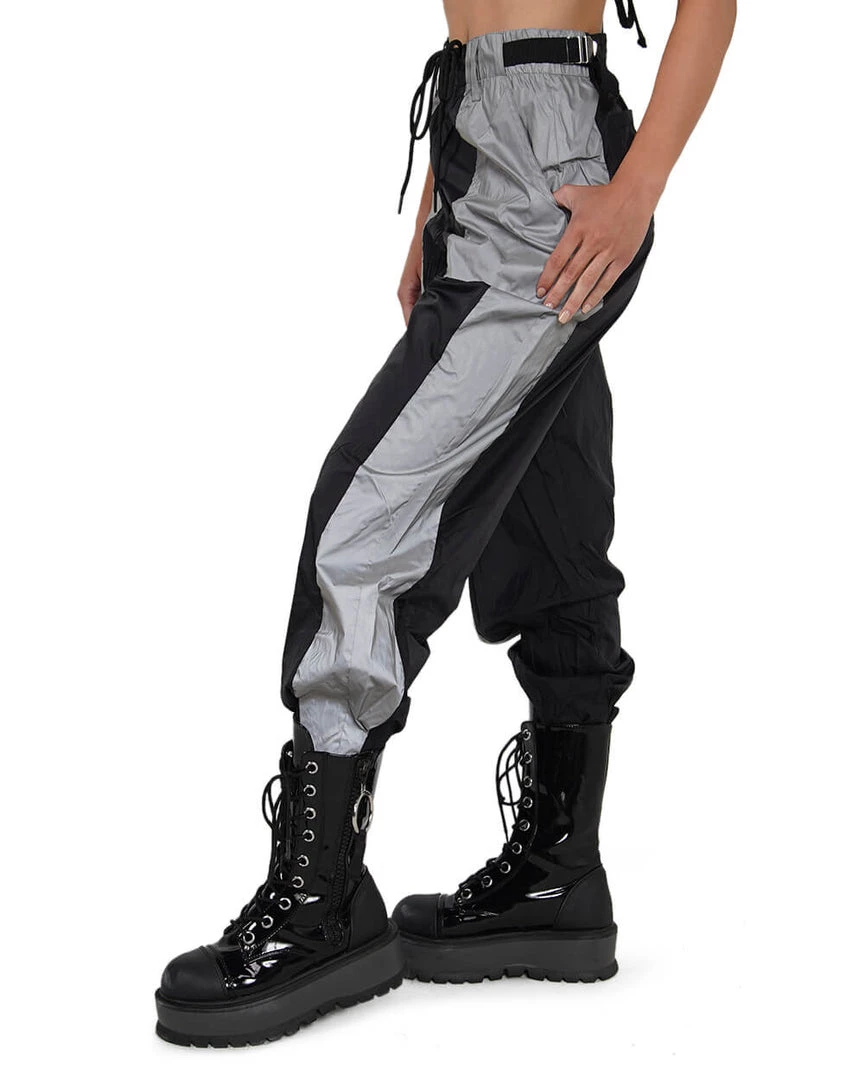 Get litty in our Time 2 Get Lit Reflective Cargo Joggers. These black and silver reflective baggy pants feature a belt and drawstring scrunch at the top for an adjustable fit. These bottoms feature two symmetrical pockets and a form-fitting ankle for a stylish athletic look.Â