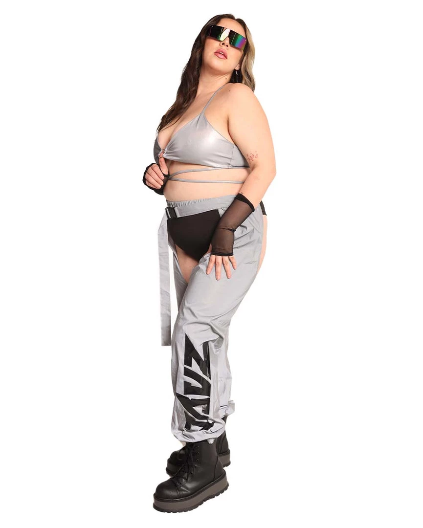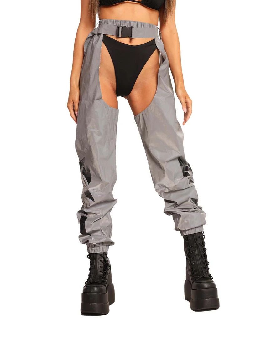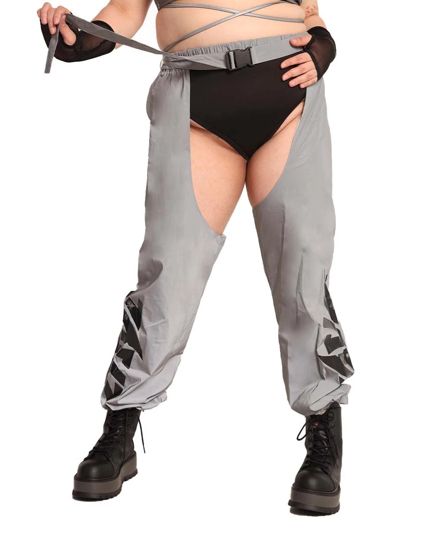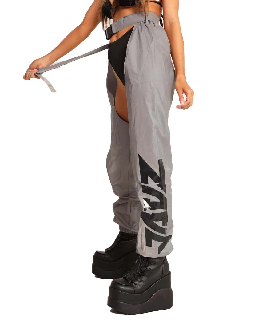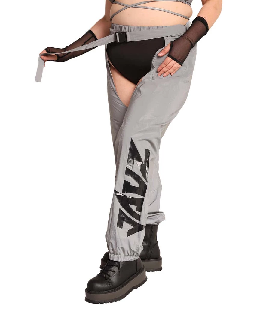 The Jauz x iHR Reflective Chaps are made extra bright just for u. These bottoms are lightweight, cuffed at the bottom, adjustable with a speed clasp belt, and most importantly, luminous.