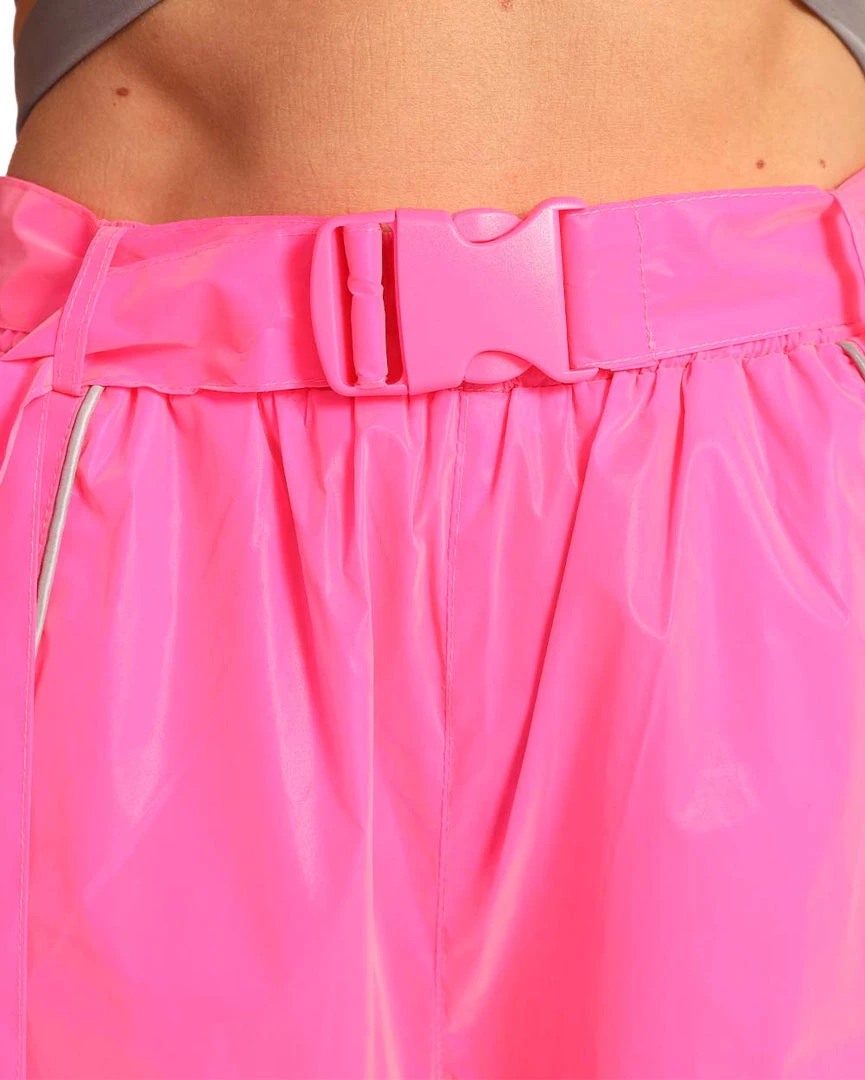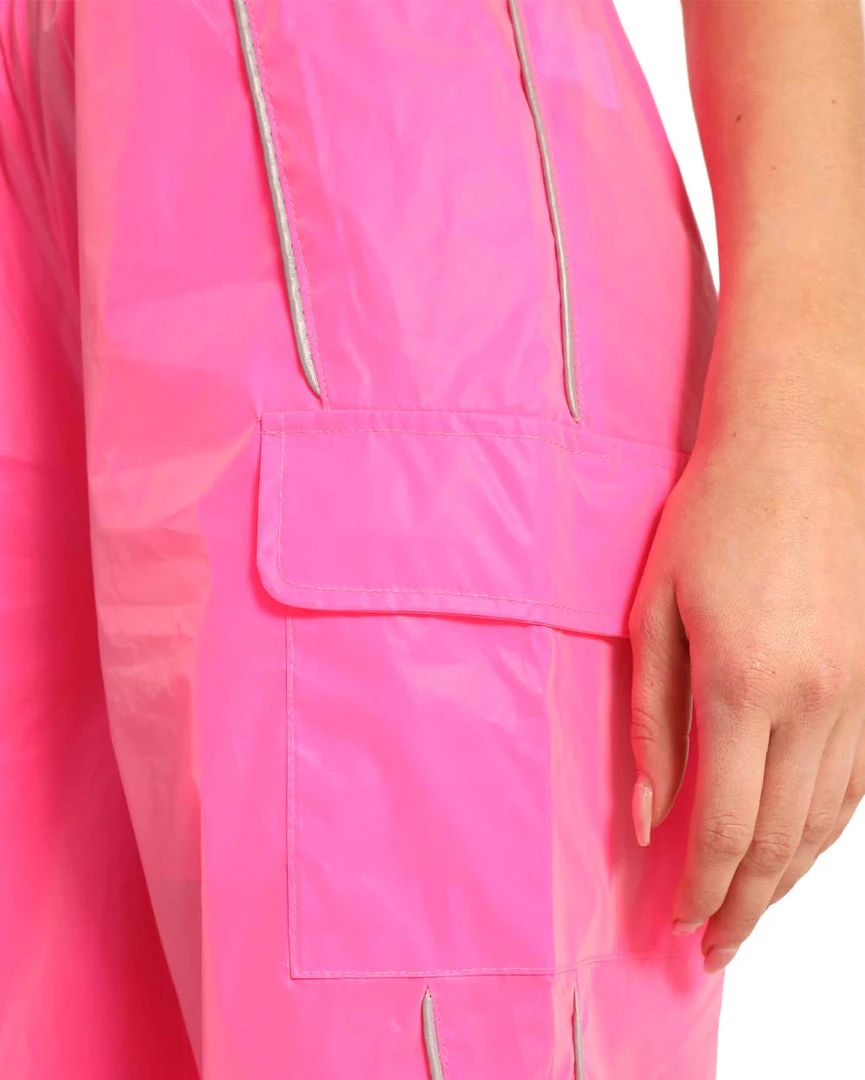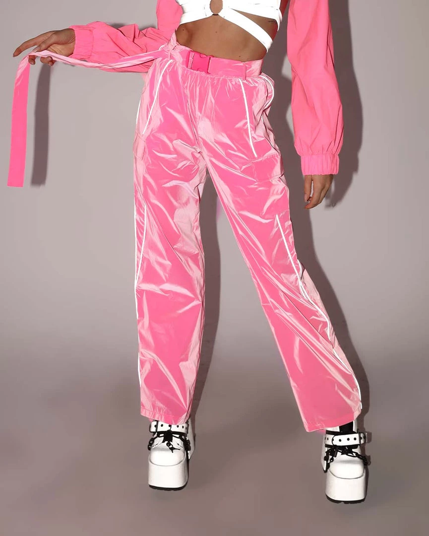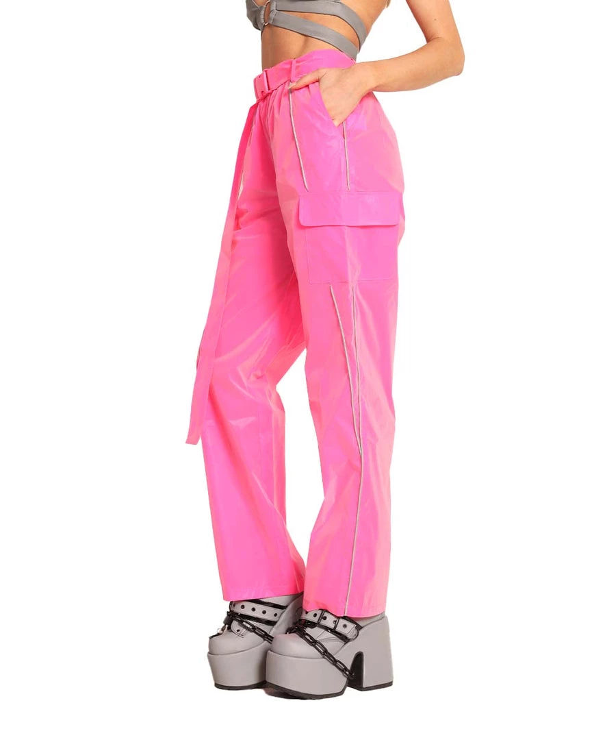 Our Joyride Speed Clasp Wide Leg Pants are a nod to Y2K. These hot pink wide-leg rave pants come with an adjustable speed clasp belt, pockets, and reflective accents on the sides.