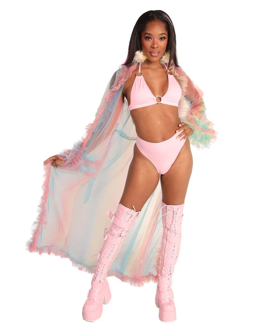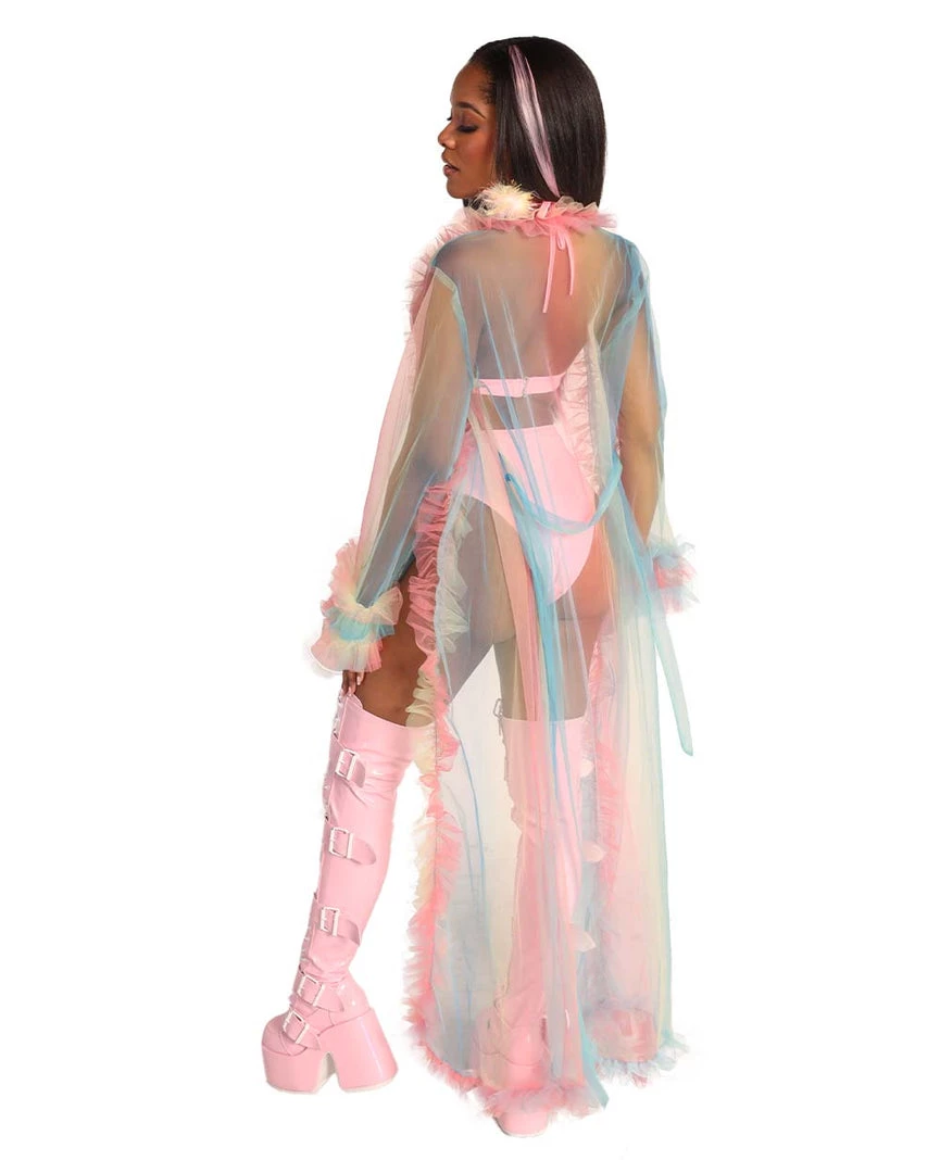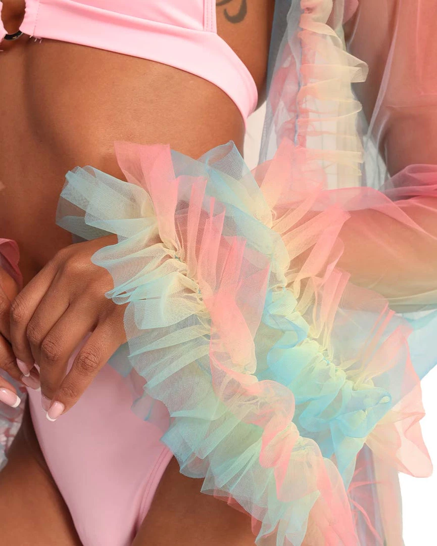 U are a rainbow angel in disguise wearing our Lover Mesh Ruffled Cover Up. This mesh robe features a stunning pink, blue, and yellow ombre print all over with ruffles on the hems.Â