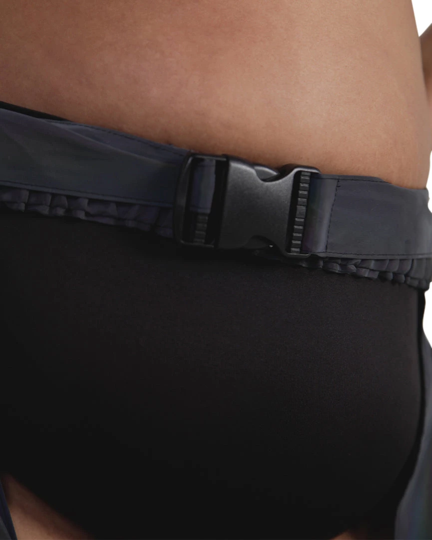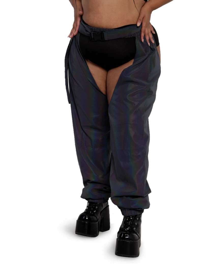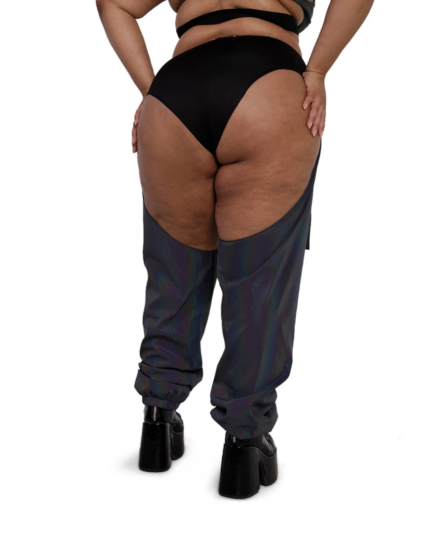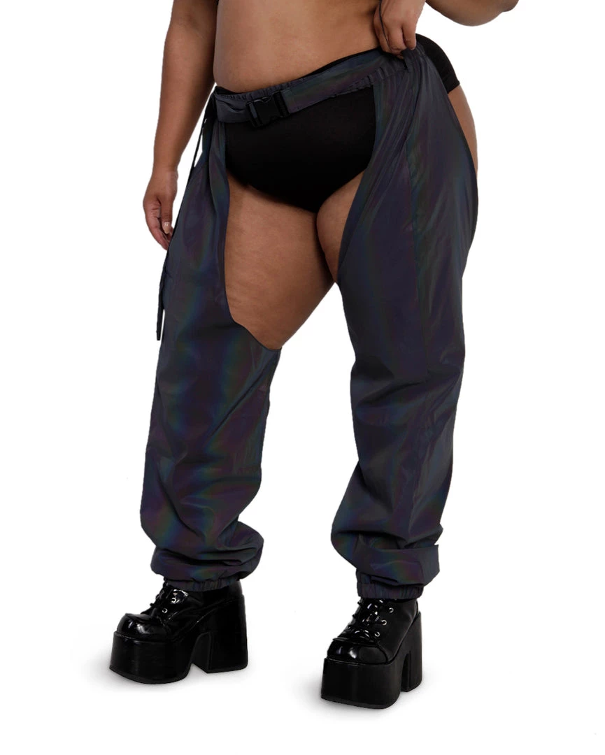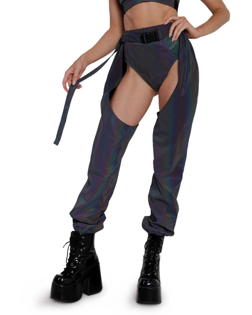 The Prism Fairy Reflective Chaps are everything u need to pop off on the dancefloor. These chaps with a speed clasp accent are reflective all over, giving off rainbow effects in the light.