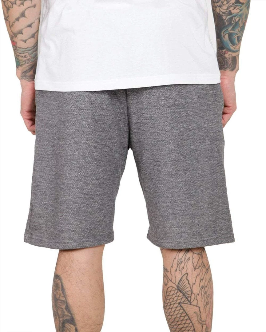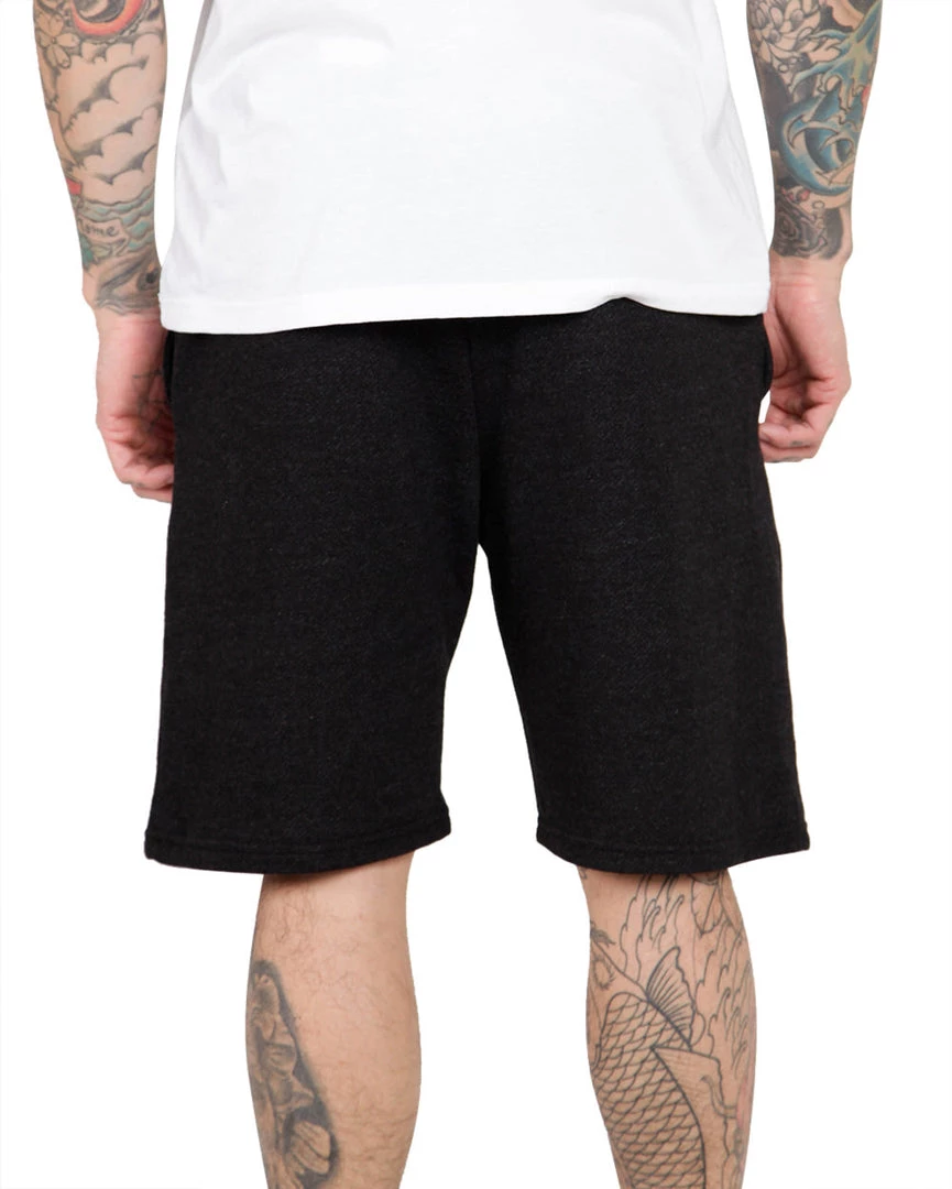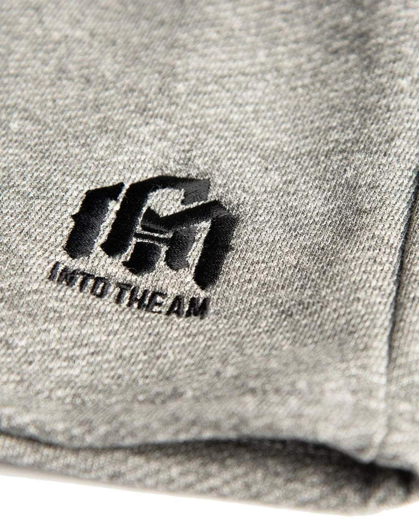 There premium charcoal grey jogger shorts are designed for comfort without sacrificing style. They feature ultra-soft fabric, an adjustable drawstring waist, and a black embroidered AM logo on the left leg.