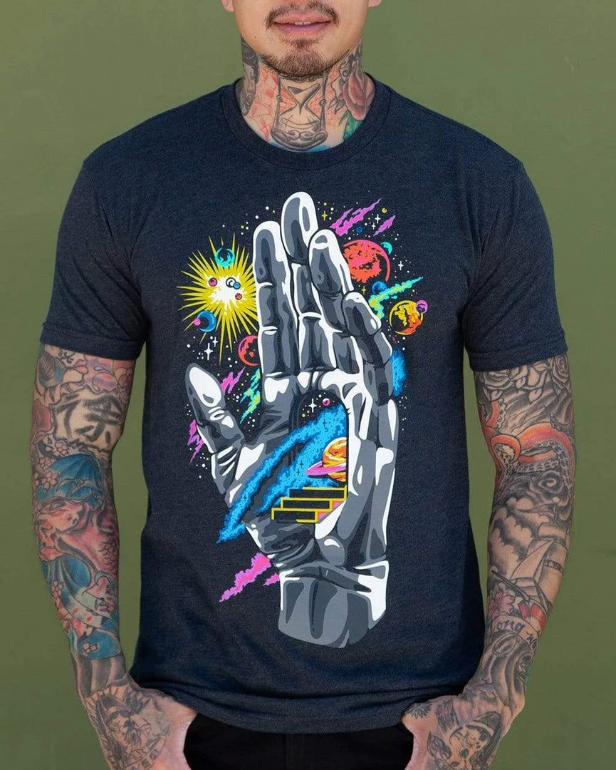 Find the guiding hand of the universe, in this vibrant graphic tee. The moons, stars, planets, and origin of the universe started here. Push through and follow the steps to your destiny with this psychedelic premium tee. It is tailored from ultra-soft fabric and printed with the highest quality inks.