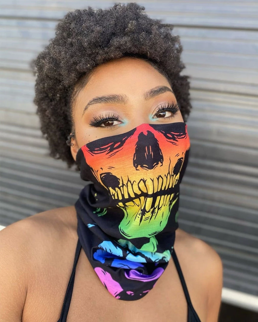 The Rainbow Skeleton Seamless Mask Bandana is a multi-functional face-covering that slides easily over your head to cover your neck, mouth, and nose. It can also be worn as a headband, wristband, hair tie, and more!