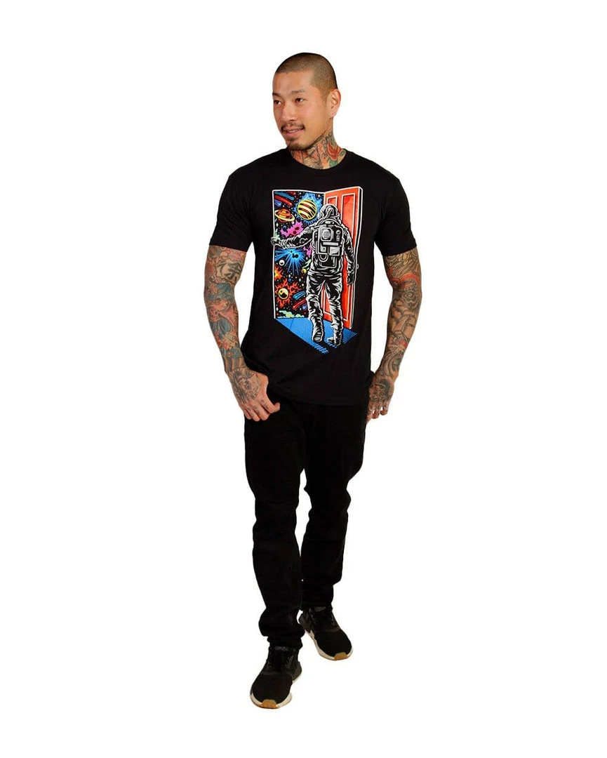 Step past your threshold and into the vibrant expanse of a mysterious universe with our original Step Beyond design on a men’s black tee. This shirt is printed with the highest quality inks and the premium poly-cotton blend gives you the best of both worlds: a buttery soft blank that is breathable doesn’t shrink and lasts longer than 100% cotton tees.