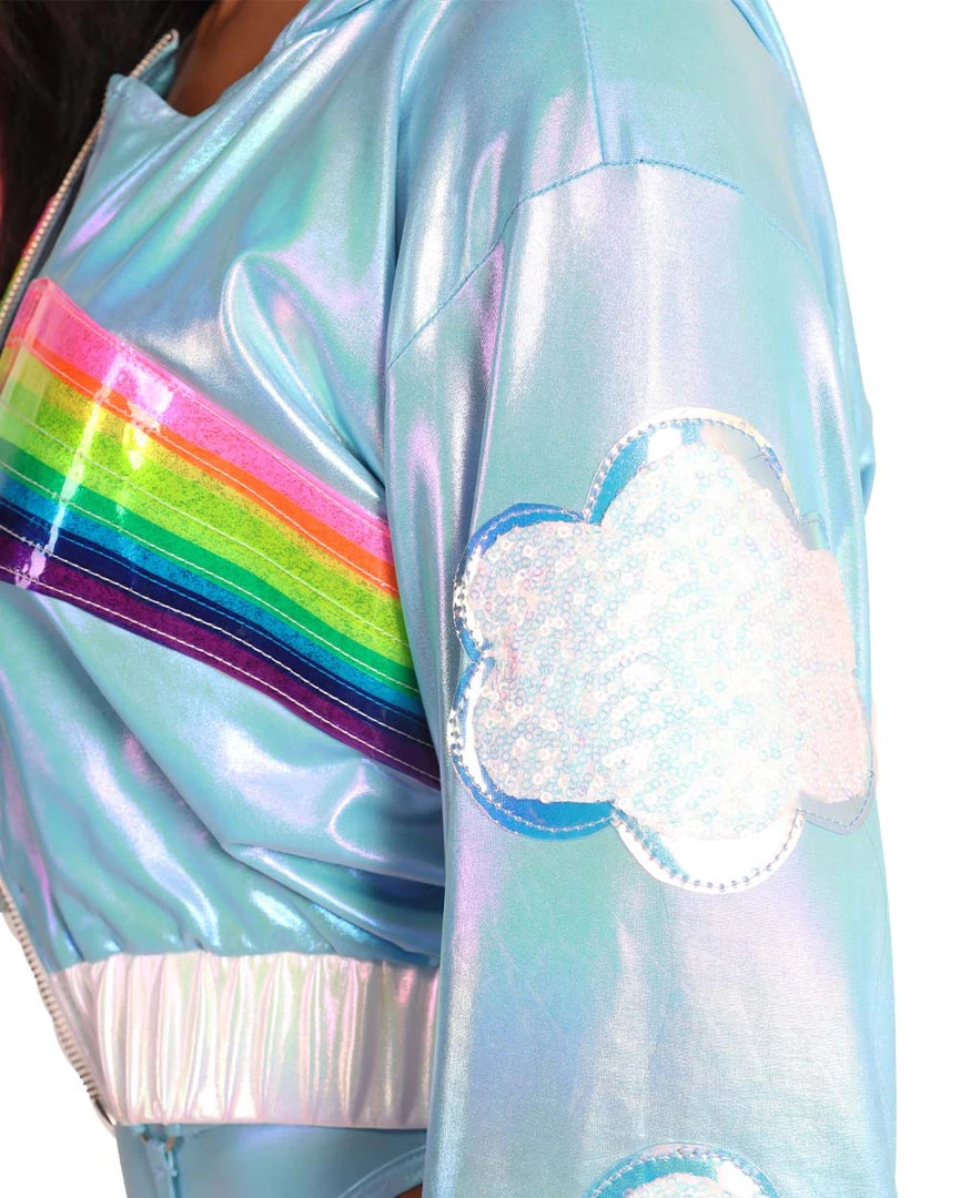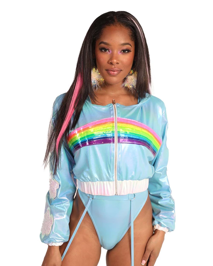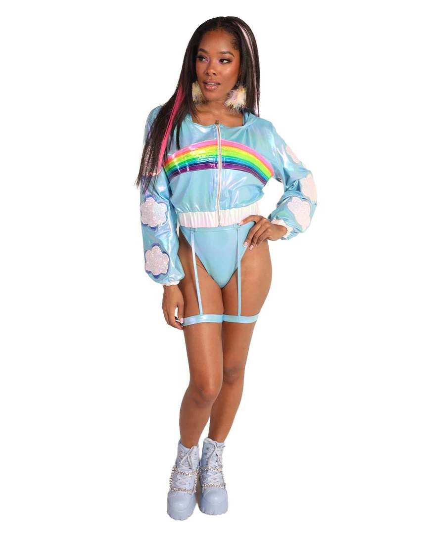 Dream in all the colors of the rainbow with our J. Valentine Rainbow Bae Jacket. This sky blue jacket has a stunning holographic sheen, a cropped cut, and is accented with cloud-shaped sequins. Pair it with ur fav bodysuit or two-piece set and finish off the look with holo leg garters, and you’re ready to slay.Â