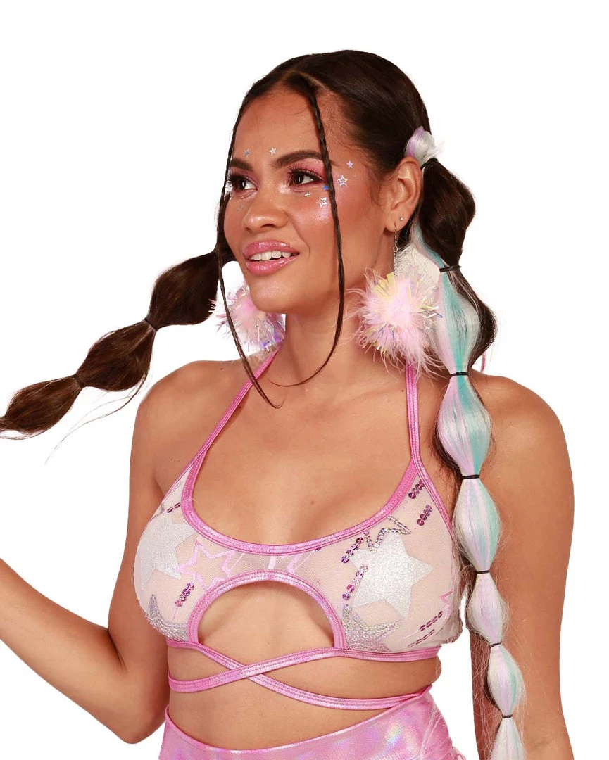 Channel ur inner intergalactic goddess with the J. Valentine x iHR Electric Stars Wrap Around Top. This top features a sparkly sequin design, a halter neckline, straps that u can wrap however u feel like, and an underboob cutout.