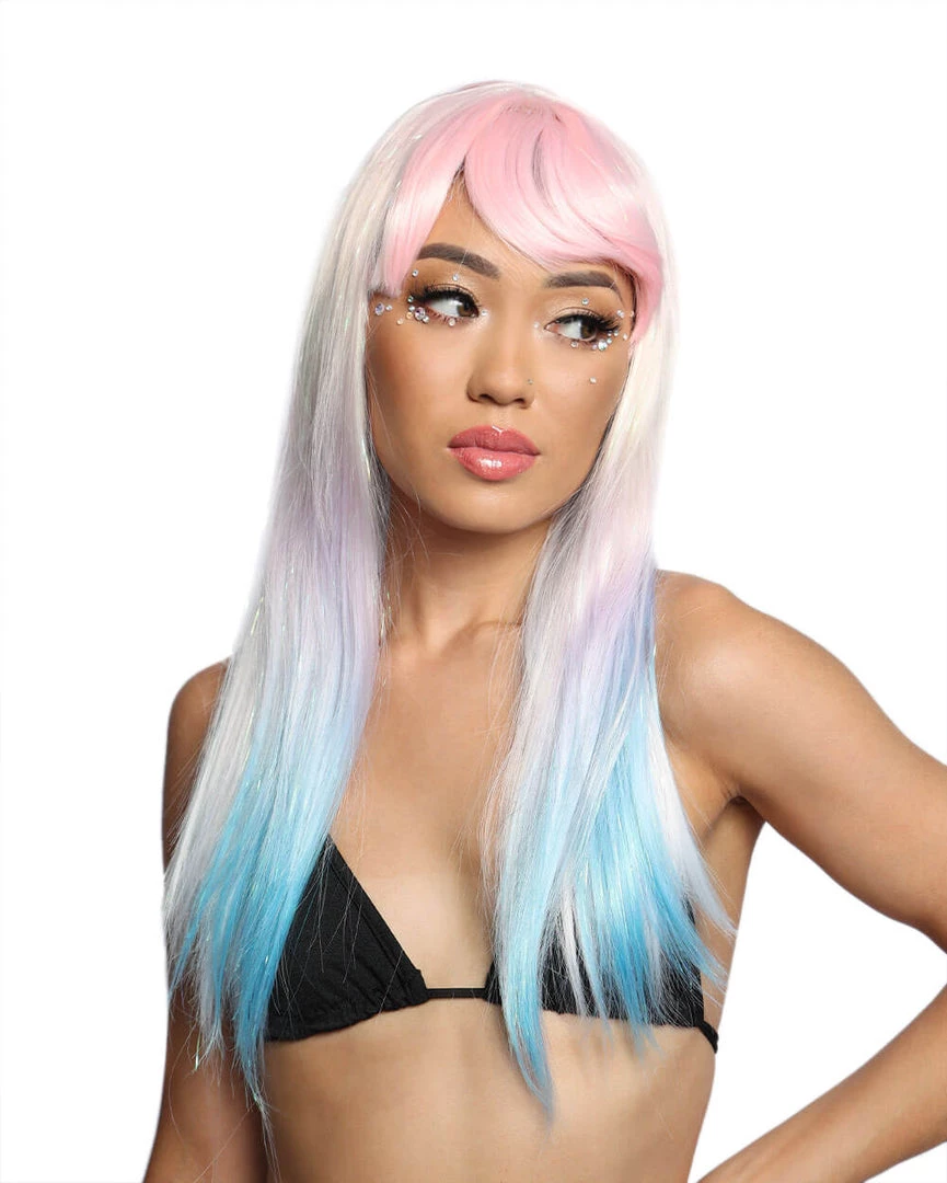 This Kandi Baby Pastel Ombre Tinsel Wig is guaranteed to complete ur magical look or fairy rave girl costume. It features a gorgeous cascade of colors, ranging from pink, yellow, purple, and blue hues.