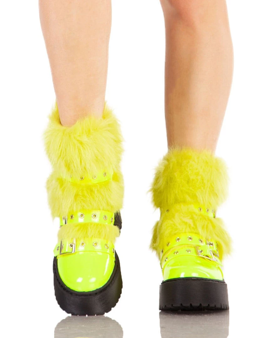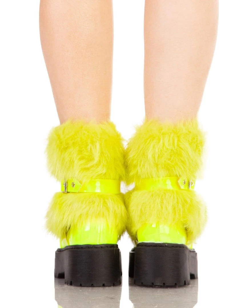Make a wild statement and stomp into the night in our Issa Mood Furry Boots. These stylish ankle-length booties will have you feeling some type of way with their bold yellow color, the tough buckle details, and the fluffiest yellow fur as the cherry on top!