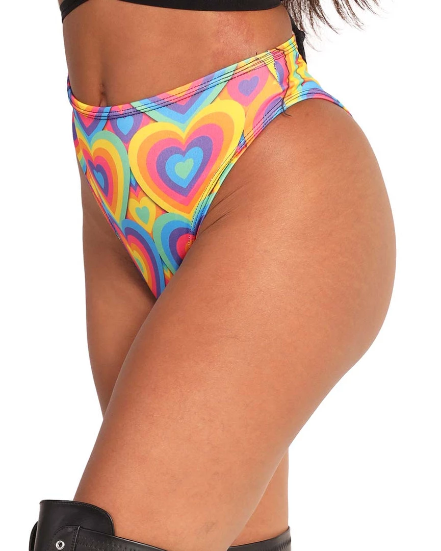Ur rave bae will want to take u dancing all day with the Lyte Couture x iHR Rainbow Ranger Hi-Cut Thong. They have a high-waisted cut, cheeky coverage, and a stunning rainbow retro heart print.Â
