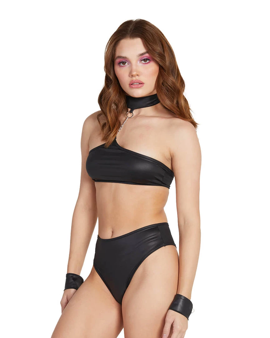 Be bold and daring in our Bondaged Baddie Two-Piece Set. A sparkly chain connects the latex tube top and choker neckline, creating an edgy look that’s perfect for ur upcoming rave event.