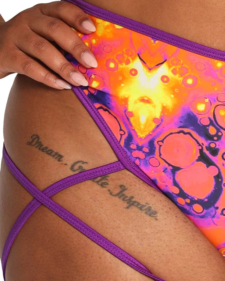 Serve extravaganza realness with our Rolita Couture x iHR Hazard Bath Wrap Me Up Bottoms. These stretchy bottoms feature a multicolored trippy print, cheeky coverage, and straps that wrap around the legs.Â
