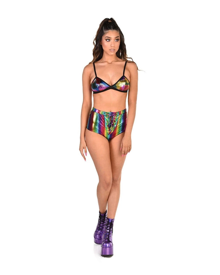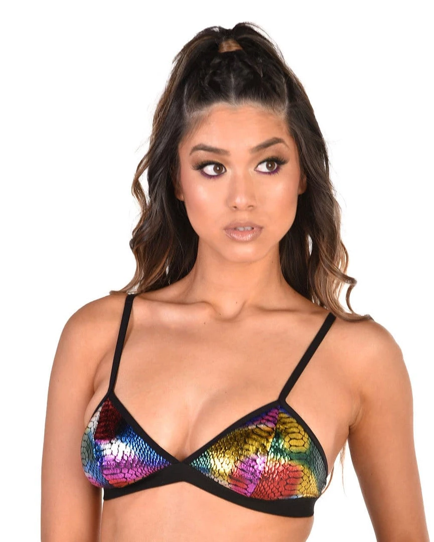 Give ‘em a sassy side eye in our Carnival Cobra Crop Top. This trendy metallic rainbow bikini style top has a stylish snakeskin design, adjustable spaghetti straps, and a hook and eye closure.