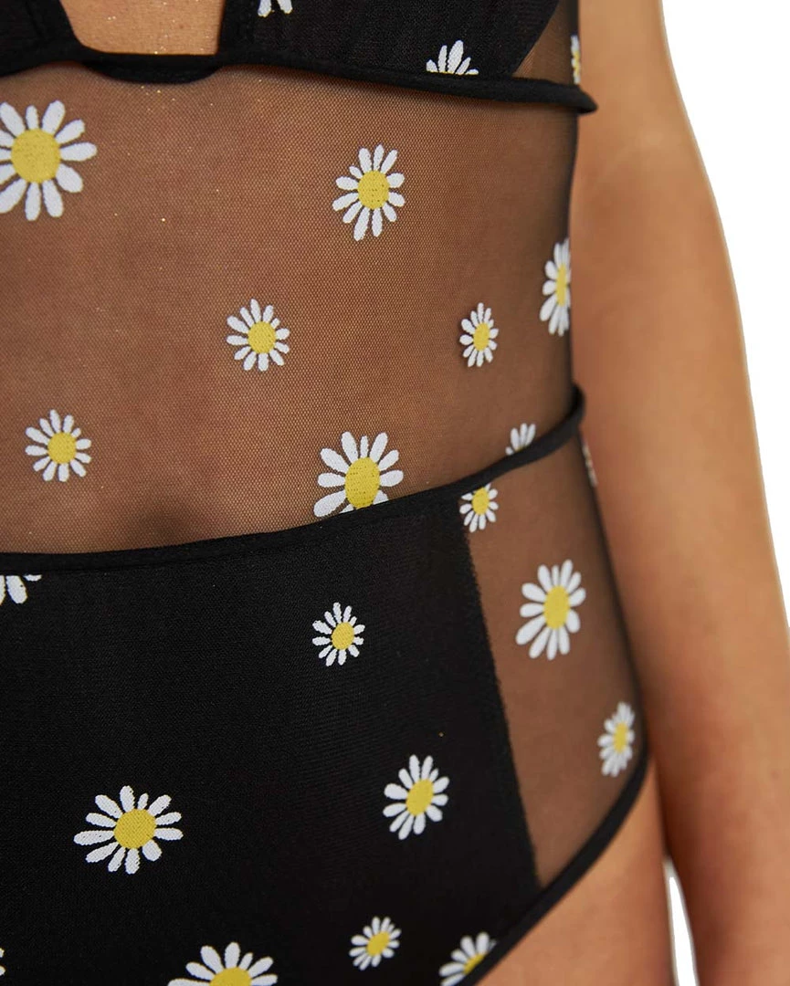 Receive tons of compliments on our Daisy Love Mesh Bodysuit. This one-piece combines the delicacy of mesh with the gracefulness of daisies and is finished off with the sultry effect of its ultra plunging neckline.Â