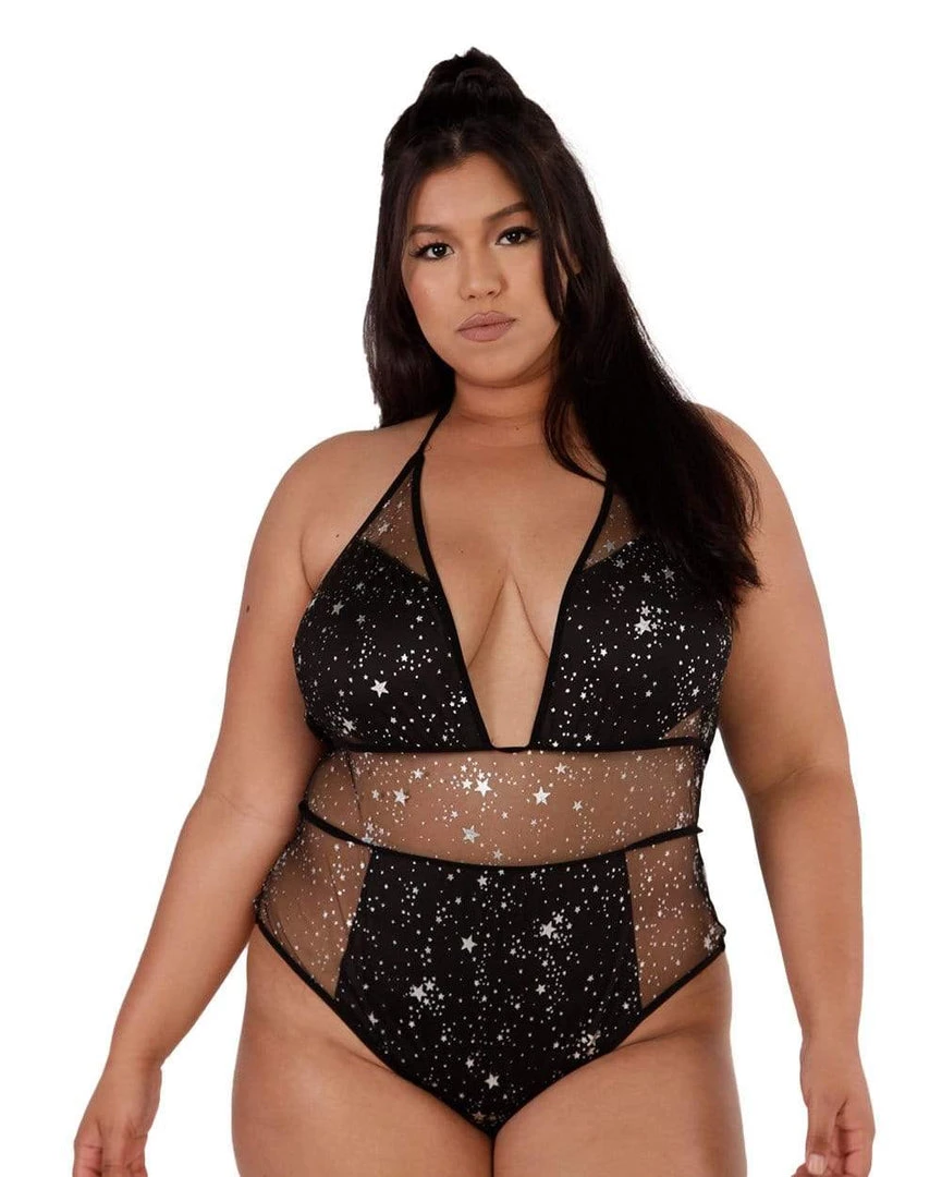 You ARE star magic in our Holo Star Mesh Bodysuit. Dance till dusk in this stunning & sparkly black one-piece that features a silver holo star fabric, mesh cutouts, and back zipper & adjustable neck tie closure.