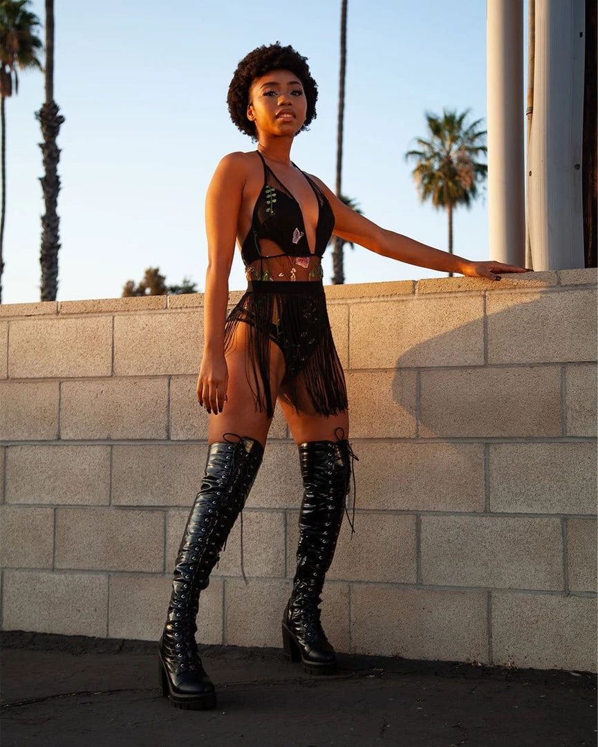 Flirt on a whole new level in our Lace Flower Fields Bodysuit. This lovely black mesh halter one-piece has a stunning floral detail, the perfect thong back with an invisible zipper and neck tie closure.