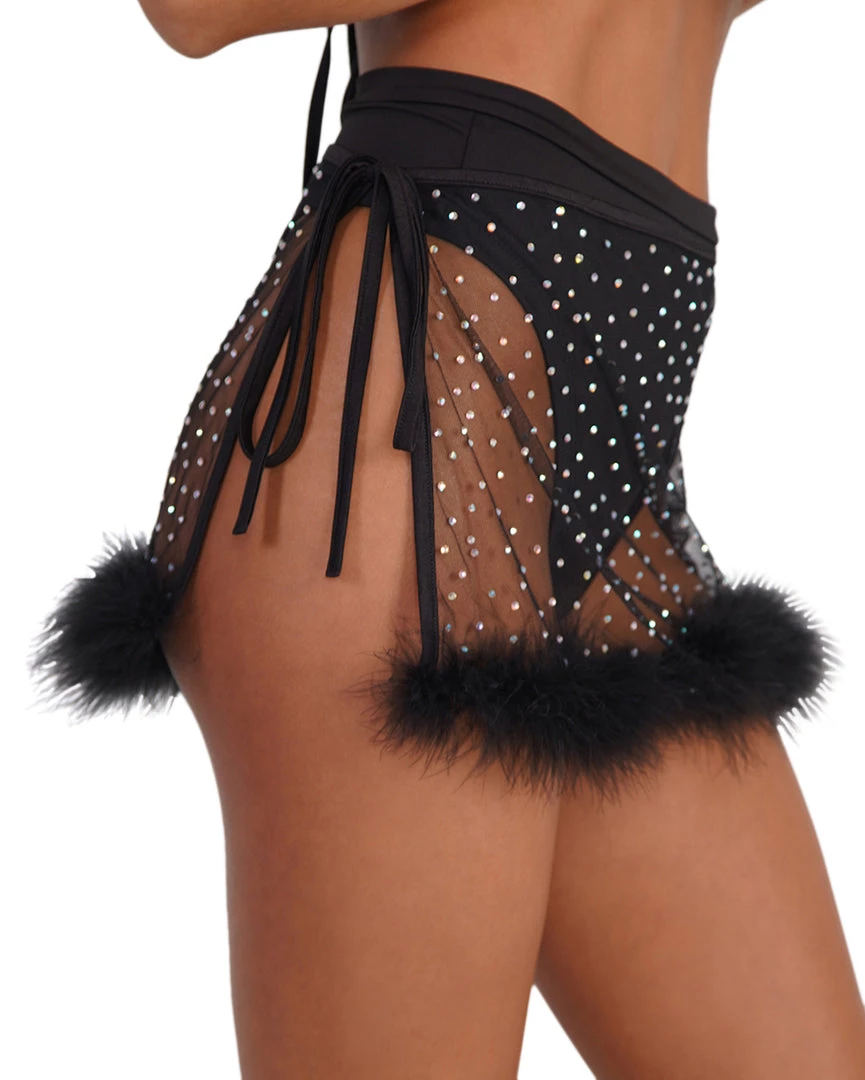 Our Midnight Sparkle Rhinestone Marabou Side Tie Mini Skirt will bring ur entire fit together. This black, sheer skirt embellished with speckles of glitter is so fun, flirty, and twirl-worthy!