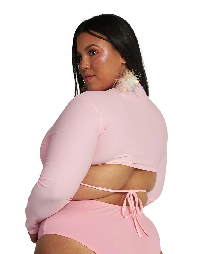 Captivate everyone’s hearts with our Pink Fairy O-Ring Strappy Top. This dreamlike top has a muted pink shade, a silver o-ring accent, skinny straps that crisscross over ur body, and a cropped cut that accentuates the underboob.Â