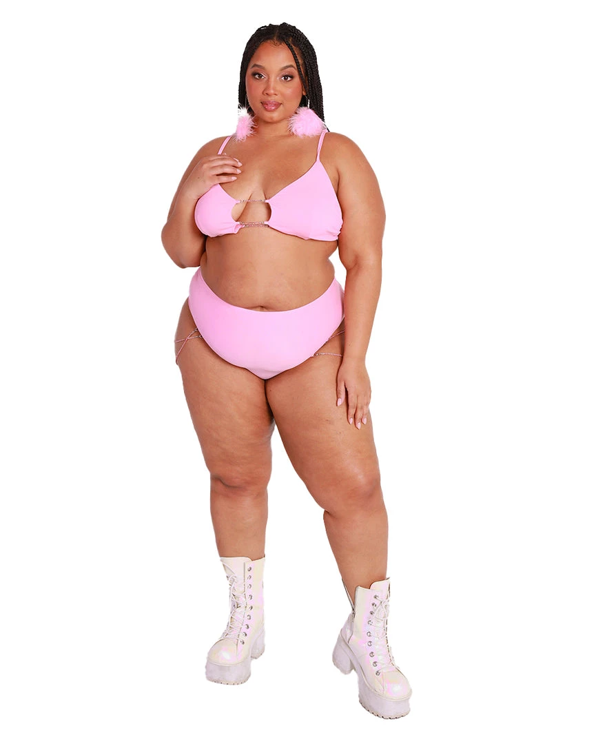 Feel sweeter than sugar with the Pinkomatic Rhinestone Cutout Bralette. This crop top features spaghetti straps, a keyhole cutout, a plunging neckline, and chains that are studded with pink sparkly gemstones.