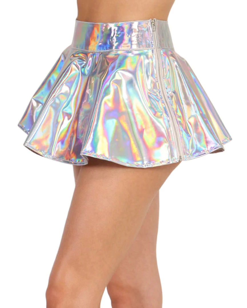 Trigger a nostalgic feeling with the Stargirl Holo Skater Skirt. It has a high-waisted cut, a flattering silhouette, and a holographic finish that draws the rainbow spectrum with the changing of the lights.