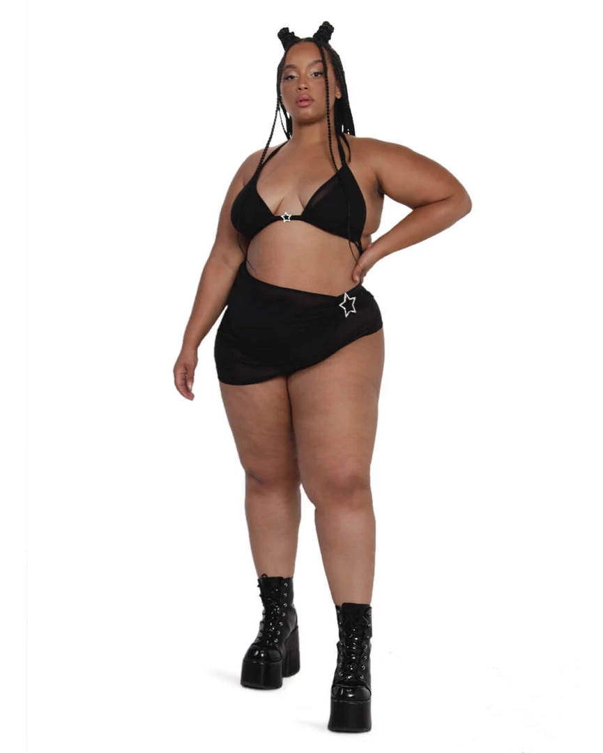 You’ll be the center of attraction with the Super Star Open Side Mini Skirt. This black skirt has an asymmetrical cut, see-through material, and a sparkly star accent on the side.