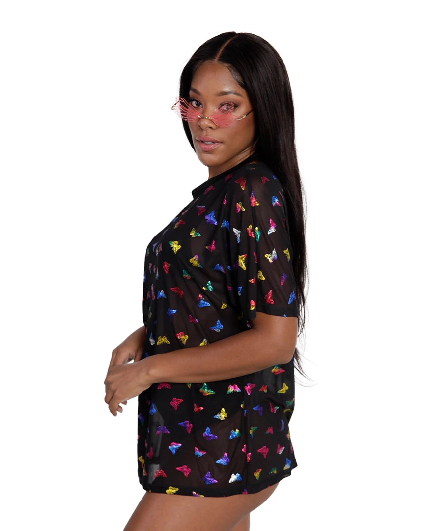 The BB Ur So Fly Mesh Oversized Tee will have u ready to get down tonight. This oversized mesh tee features colorful butterfly graphics all over and looks terrific when worn with any of our platforms and leg wraps.