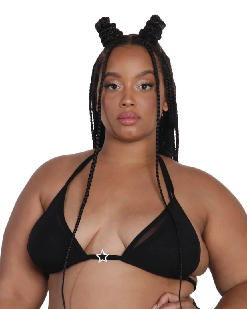 You’ll be the center of attraction with our Super Star Mesh Triangle Top. Designed with a see-through material and a sparkly star accent in the trim, this top looks fabulous with its matching asymmetrical skirt.