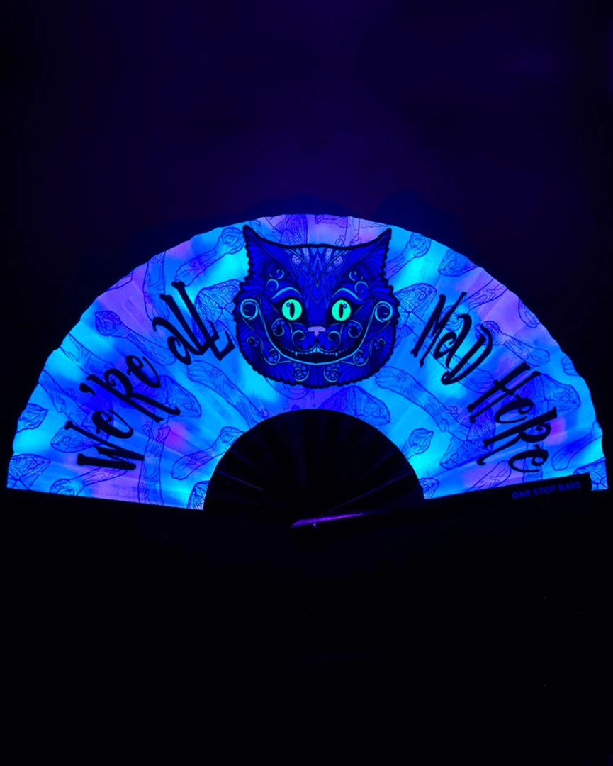 Bring magic to ur next rave event with the One Stop Rave UV Mad Catter Hand Fan. The Cheshire cat print along with the words “We’re all mad here” makes this fan stand out.