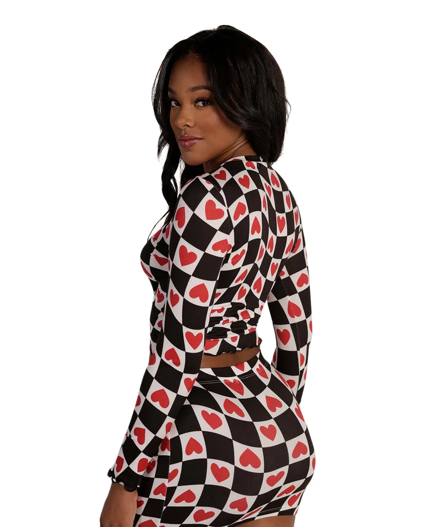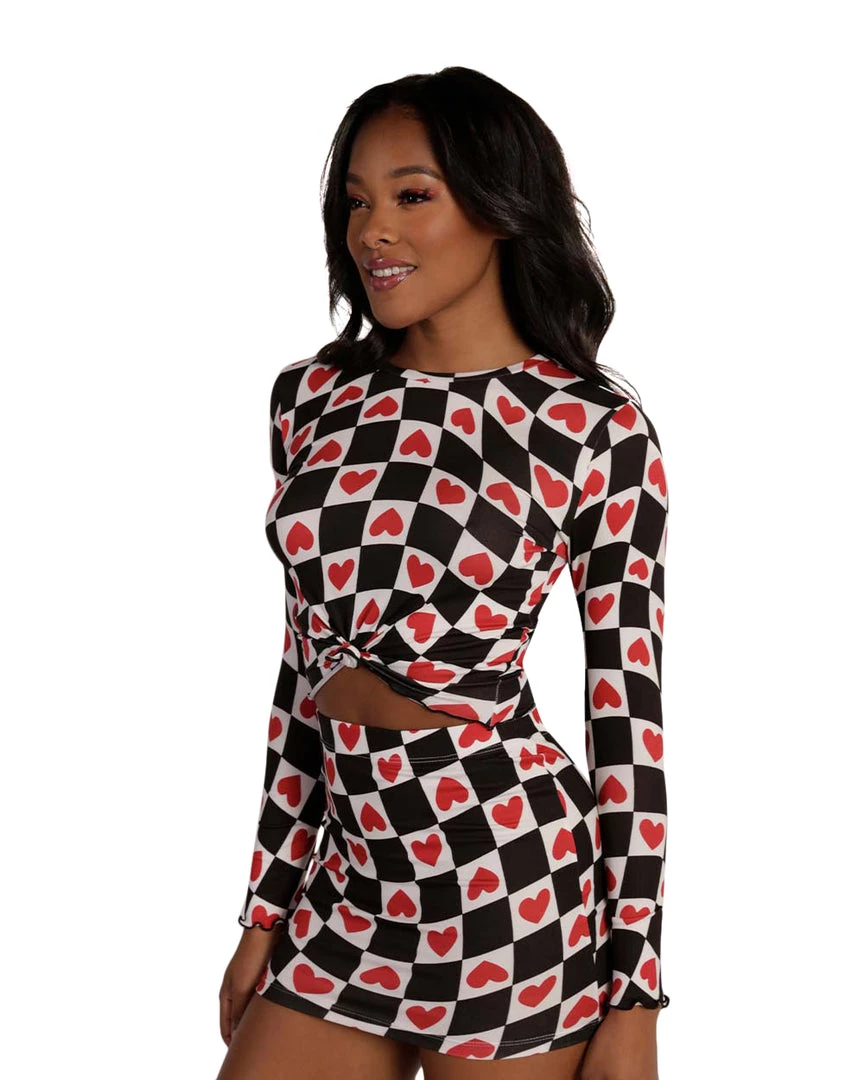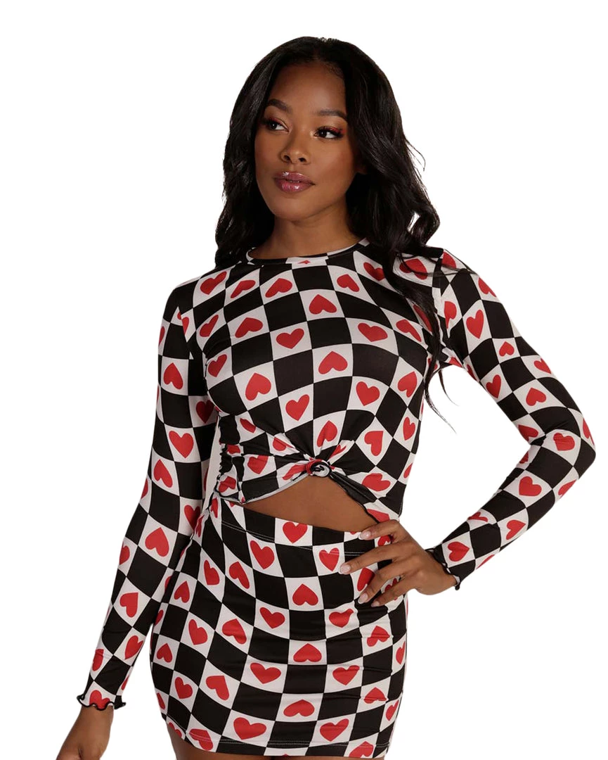 Steal hearts in our Heartbreaker Ruffled Long Sleeve Top. Featuring a unique print, ruffle trim, and tie-front design, this long sleeve top with its matching skirt is guaranteed to be a show-stopper at ur next rave event.