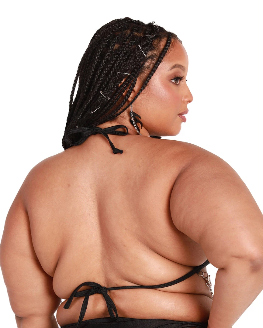 Show off your edgy side in our Rolita Couture X iHR Black Rebel Chain Top. This stylish and exclusive black crop top has a flirty center-cut, with a center o-ring detail and badass removable chain detailing. This is an essential rave top with an edgy twist.